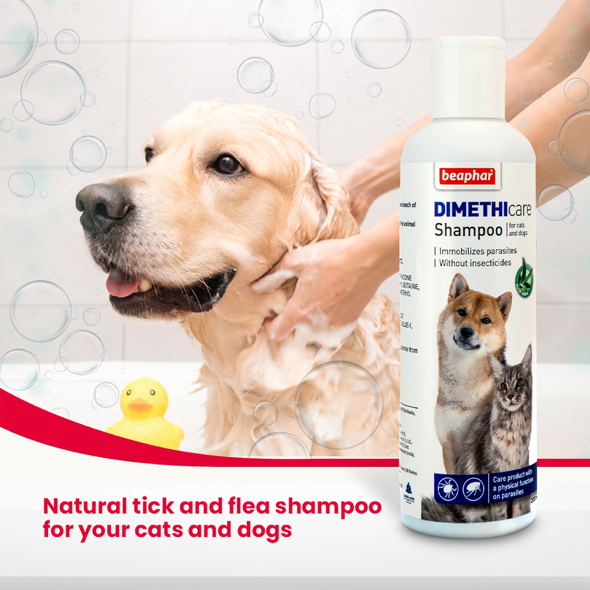 Beaphar DIMETHI care Shampoo is a care product containing dimethicone which immobilizes ticks, fleas and other parasites such as mosquitoes, mites and lice through purely physical means. The product does not contain chemical insecticides.