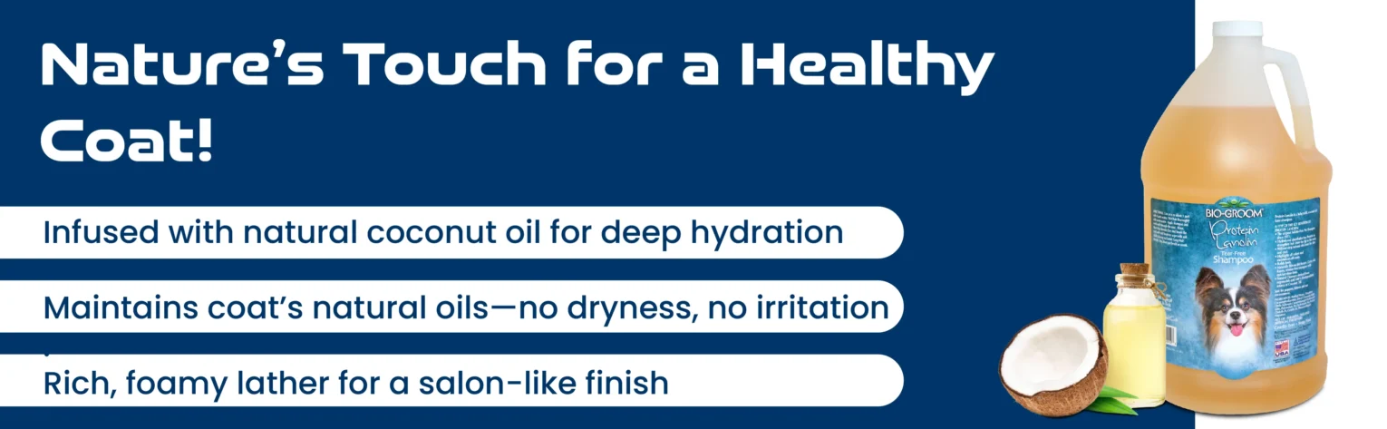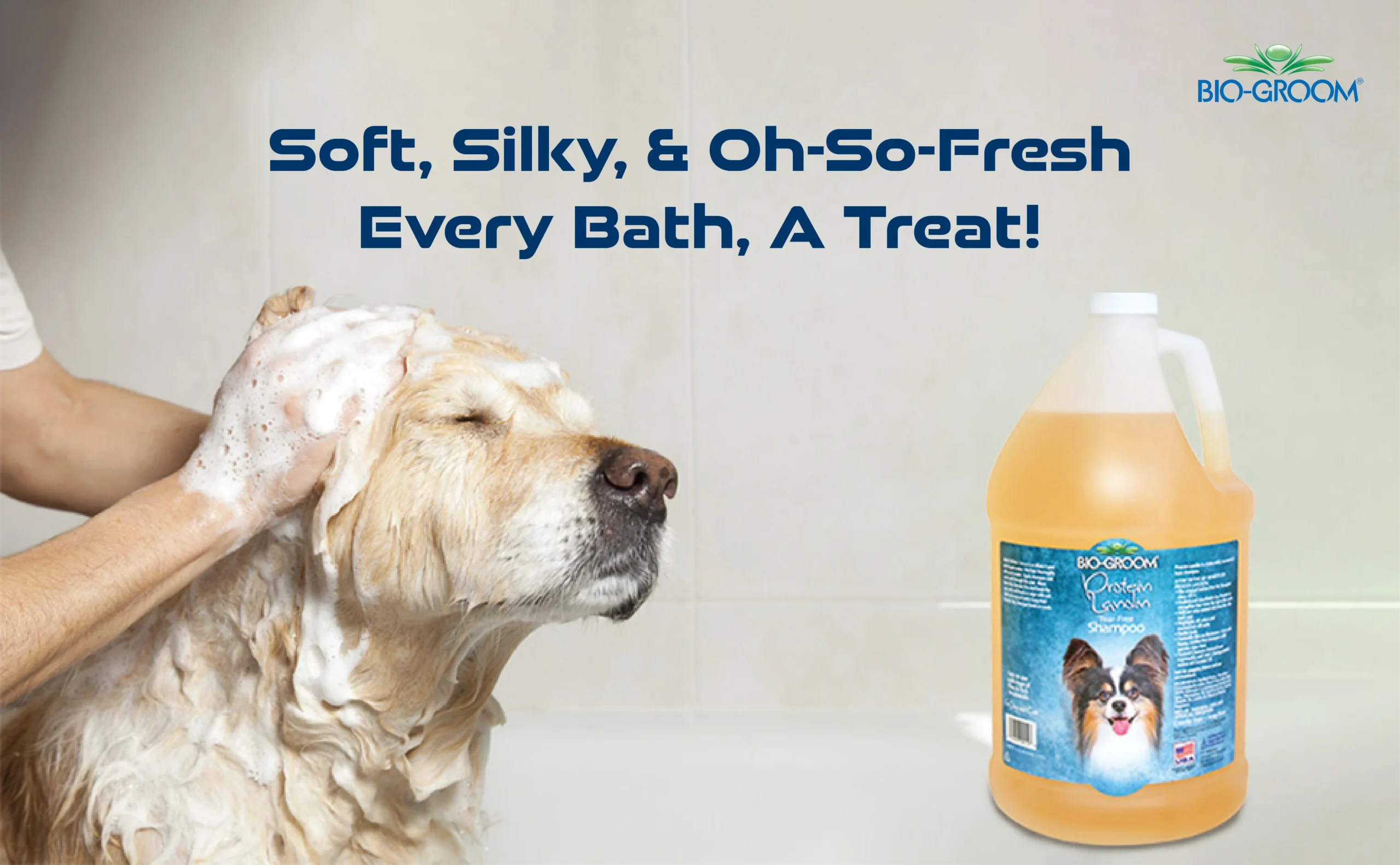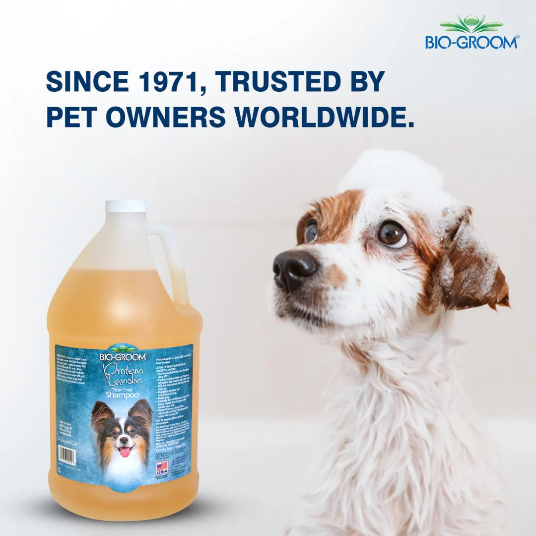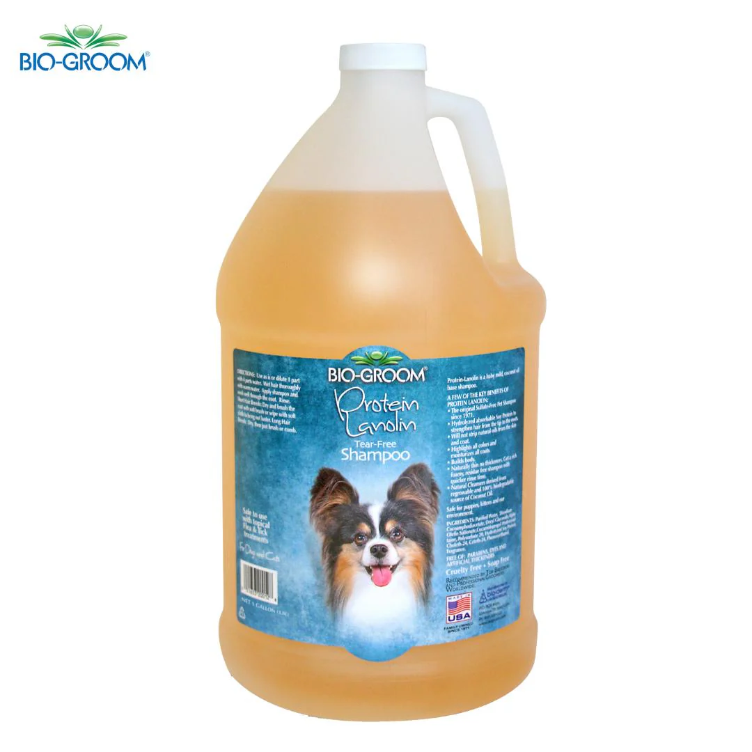 Bio-Groom's Protein Lanolin Shampoo, the original Sulfate-Free Pet Shampoo since 1971, is a tear-free, sulfate-free, baby-mild, and coconut oil-based pet shampoo. The formula will not strip natural oils from the skin or coat, and the absorbable protein strengthens hair from tip to roots. This shampoo highlights all colours, moisturises all coats, and builds the body. It works to a rich foam but rinses out quickly for residue-free results. It is free of parabens and artificial thickeners, and is safe to use in conjunction with topical flea and tick treatments. The natural cleansers in this shampoo are derived from growable and 100% green sources of coconut oil. To use, thoroughly wet your pet's hair with warm water, apply the shampoo, and work it through the coat.