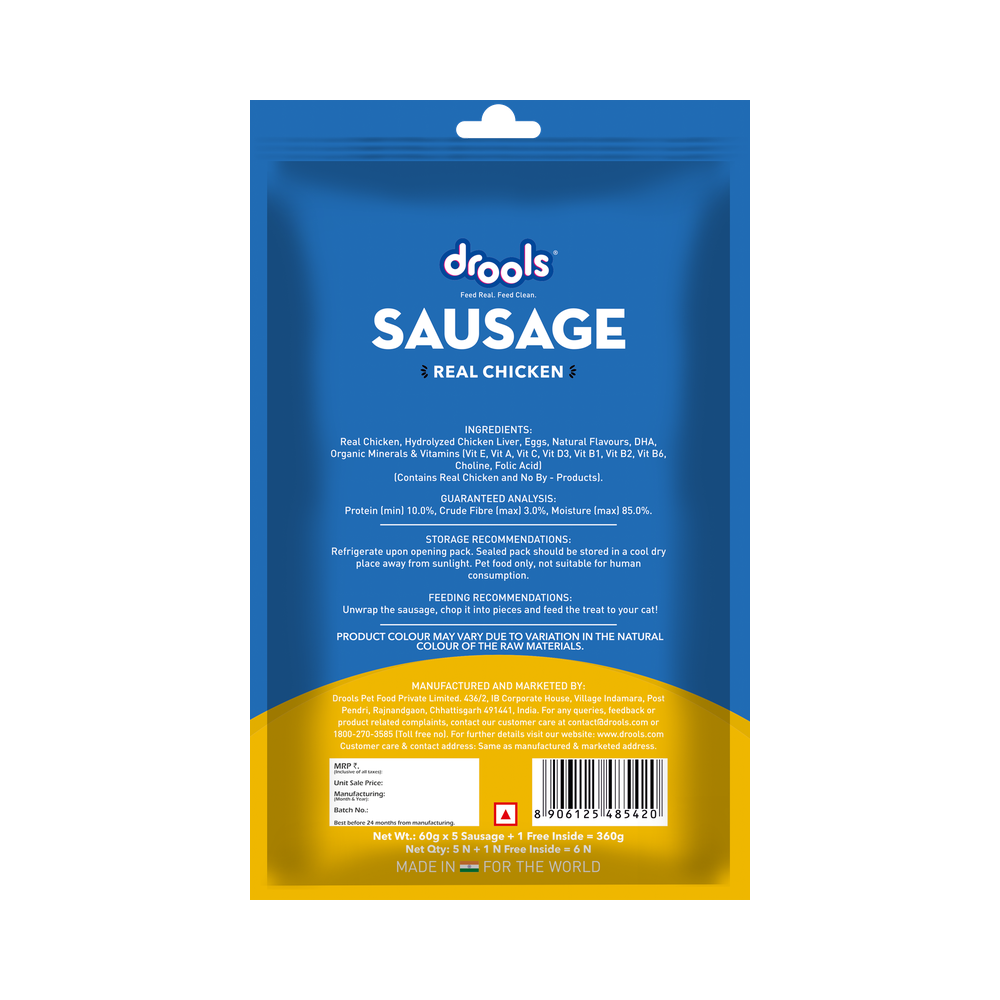 Treat your Cat to the savory goodness of Drools Cat Sausage! Made with real chicken, hydrolyzed chicken liver, and enriched with essential nutrients, this sausage is a delicious and nutritious snack that your Cat will love.