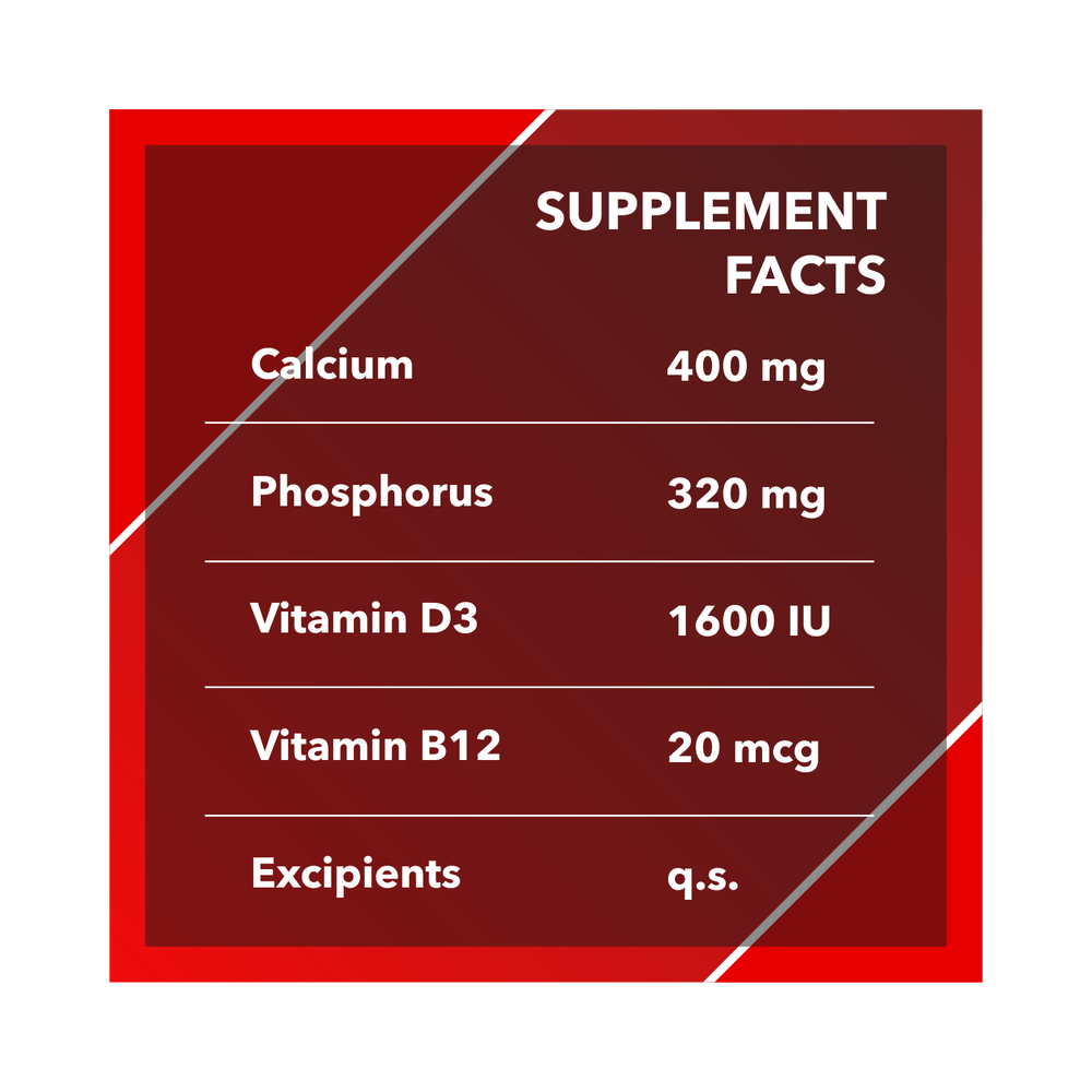 Calcium 400 mg, Phosphorus 320 mg, Vitamin D3 1600 IU, Vitamin B12 20 mcg, Excipients Q.S.