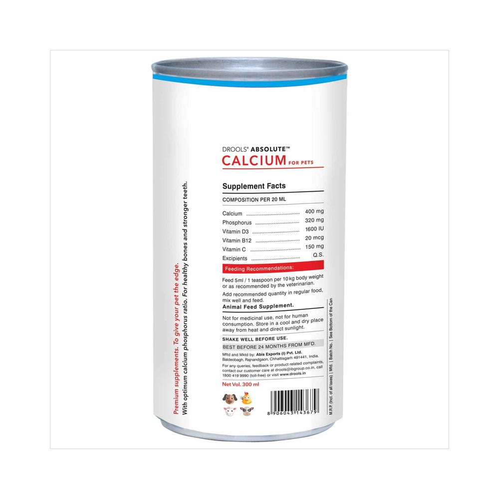 Drools Absolute Calcium Syrup is a premium supplement that is a thick syrup that fulfills calcium and phosphorous deficiency in your dog. Adequate calcium improves dental and joint health by making bones and teeth stronger. It is a highly palatable syrup.