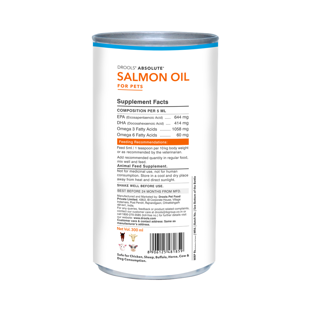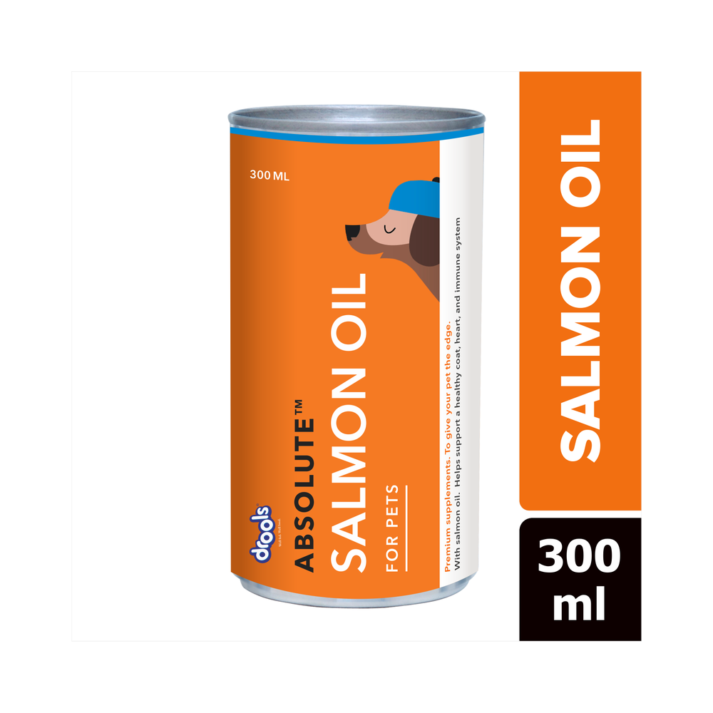 Drools Absolute Salmon Oil provides a daily supplement rich in EPA and DHA – the best Omega-3 fatty acids, that supports healthy skin and coat. Most dog's metabolism use these nutrients immediately without any conversion. Hence it supports immune system, joint health, also keeps your dog healthy.