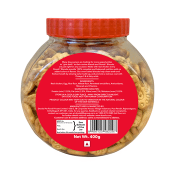 Drools biscuits are real nutritious treats which gives immense happiness to your furry friend. Our oven baked biscuits are filled with complete & balanced nutrition. With no added colours and flavours these treats help in maintaining clean teeth and freshen breath by reducing tartar build up. Omega 3 present in it gives your fur ball a healthy and lustrous coat.