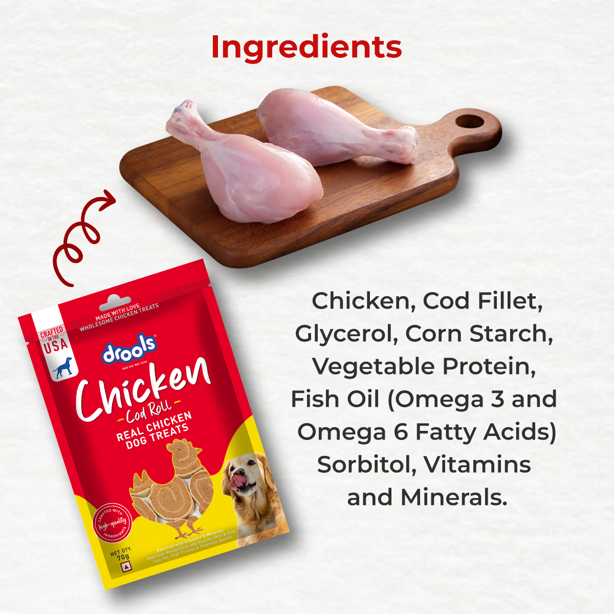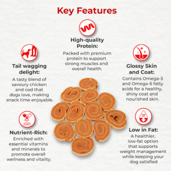 Treat your dog to the irresistible taste of our Chicken and Cod Roll Treats and watch their excitement shine! Made with high-quality protein and enriched with essential nutrients for a shiny coat, joint health, and overall well-being, these treats offer both flavor and nutrition—paw-fect for any snack collection. Remember to serve them in moderation, as these tasty treats are not a meal replacement