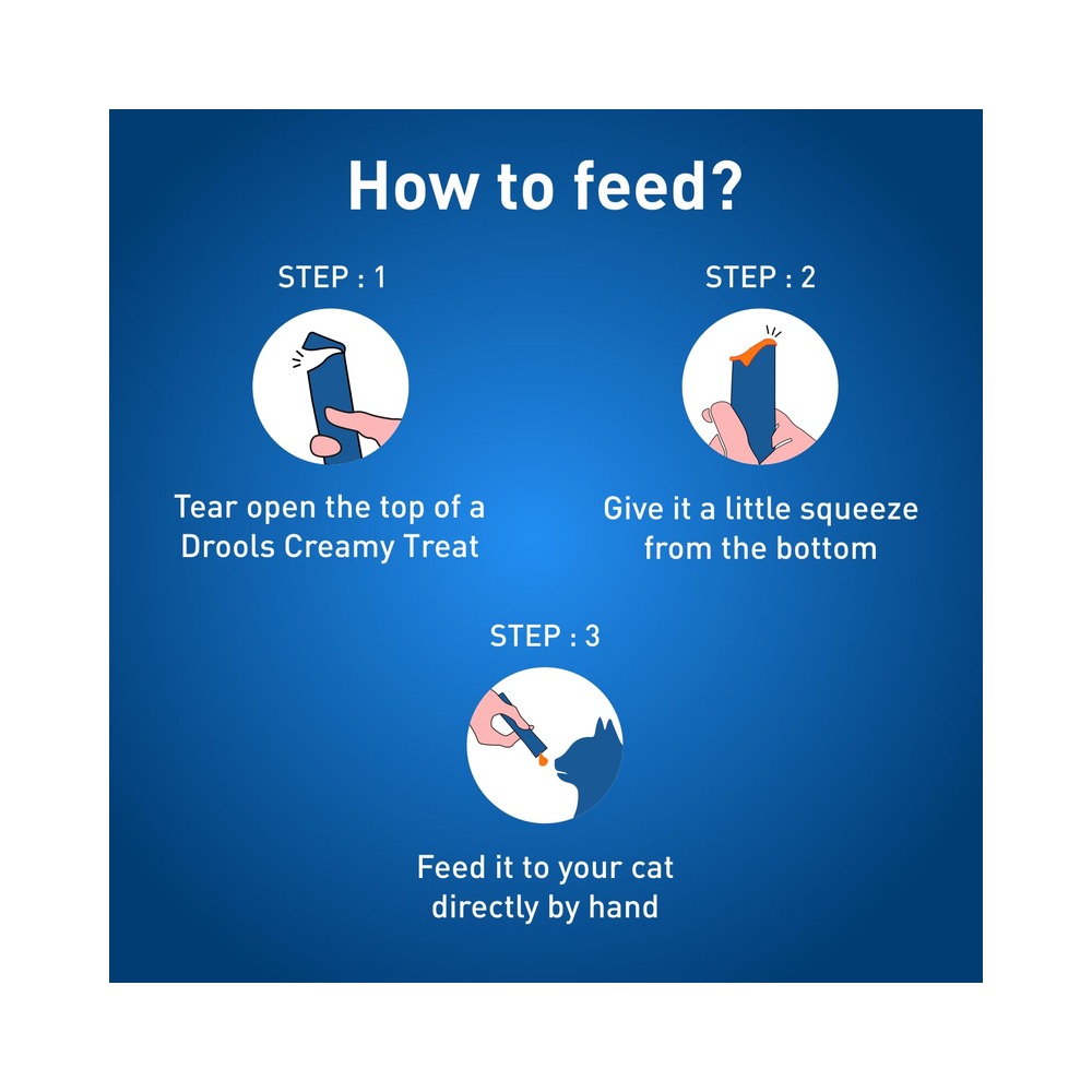 Step 1: Tear open the top of a creamy treat, Step 2: Give it a little squeeze from the bottom , Step 3: Feed it to your cat directly by hand