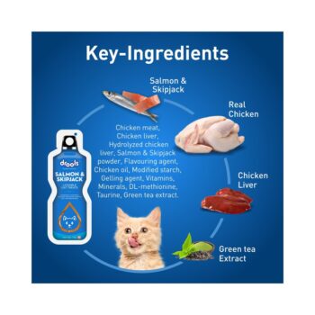 Chicken meat, Chicken liver, Hydrolyzed chicken liver, Salmon & skipjack powder, Flavouring agent, Chicken oil, Modified starch, Gelling agent, Vitamins, Minerals, DL-methionine, Taurine, Green tea extract.