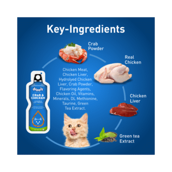 Chicken meat, Chicken liver, Hydrolyzed chicken liver, crab powder, Flavouring agent, Chicken oil, Modified starch, Gelling agent, Vitamins, Minerals, DL-methionine, Taurine, Green tea extract.
