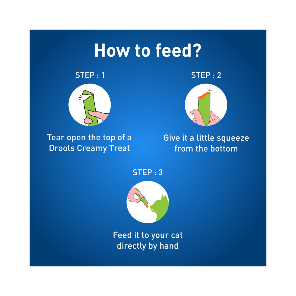 Step 1: Tear open the top of a creamy treat, Step 2: Give it a little squeeze from the bottom , Step 3: Feed it to your cat directly by hand