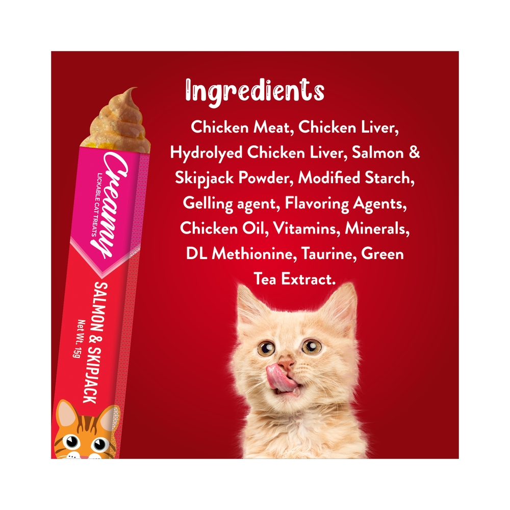 Chicken meat, Chicken liver, Hydrolyzed chicken liver, Salmon & skipjack powder, Flavouring agent, Chicken oil, Modified starch, Gelling agent, Vitamins, Minerals, DL-methionine, Taurine, Green tea extract.