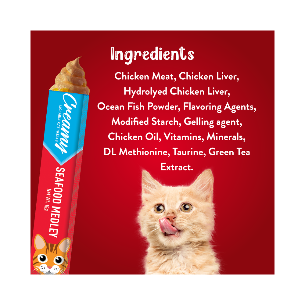 Chicken meat, Chicken liver, Hydrolyzed chicken liver, Sea Food powder, Flavouring agent, Chicken oil, Modified starch, Gelling agent, Vitamins, Minerals, DL-methionine, Taurine, Green tea extract.