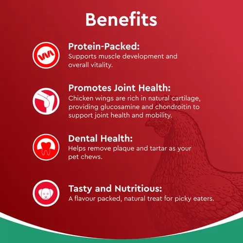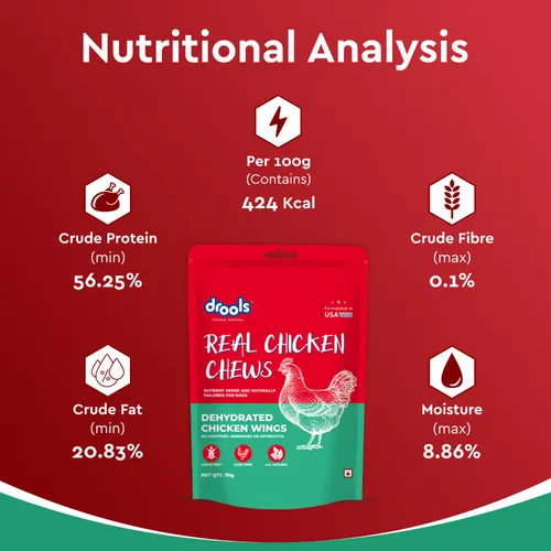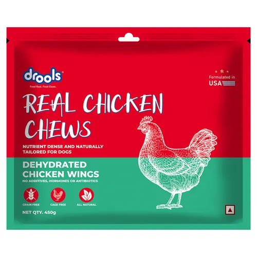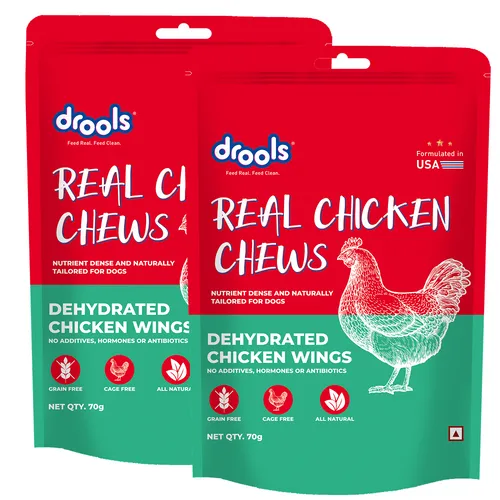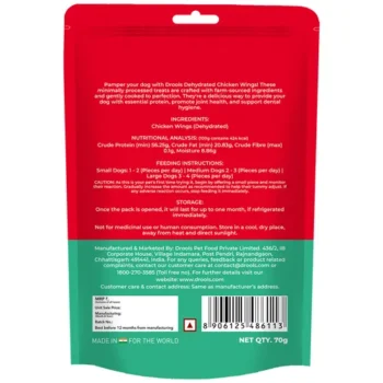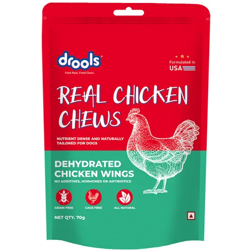 Pamper your dog with Drools Dehydrated Chicken Wings! These minimally processed treats are crafted with farm-sourced ingredients and gently cooked to perfection. They're a delicious way to provide your dog with essential protein, promote joint health, and support dental hygiene.