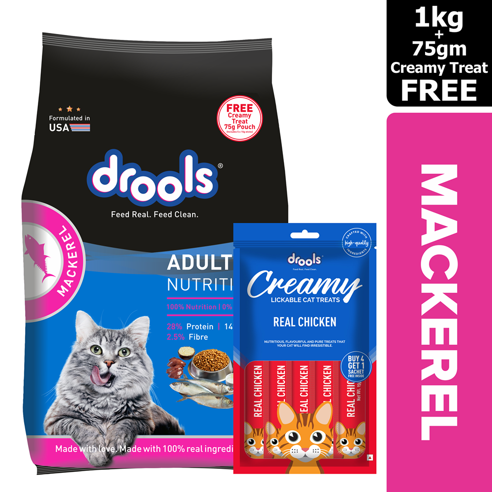 Drools Mackerel Adult Cat Dry Food is a premium cat food designed to provide your feline friend with the essential nutrients they need to thrive. Specially formulated for adult cats, this delicious dry food features mackerel as the primary ingredient, ensuring high-quality protein and a taste that cats love. Rich in essential fatty acids, vitamins, and minerals, this balanced diet supports overall health and well-being, making it an ideal choice for maintaining your cat's vitality and happiness.