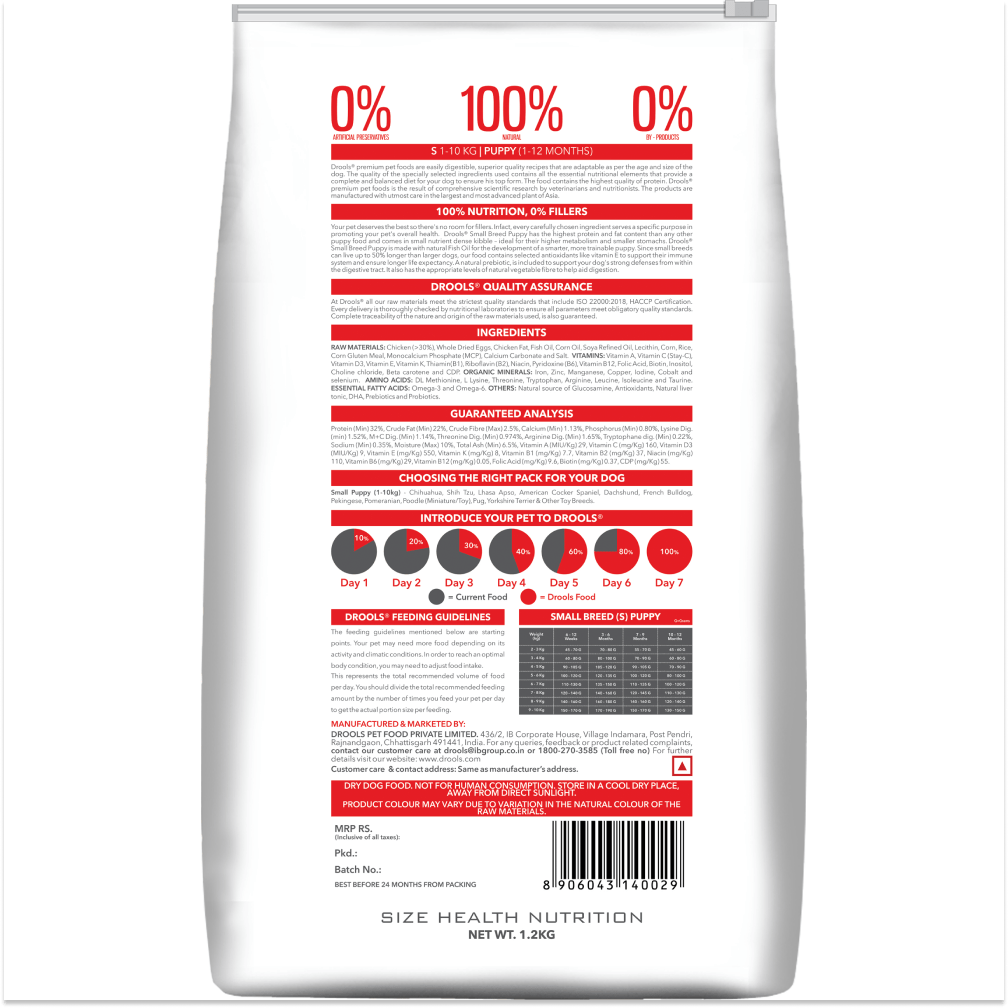 Drools Premium Small Breed Puppy Dog Dry Food is meticulously formulated to cater to the unique nutritional needs of small breed puppies. This premium dog food provides a balanced diet packed with essential nutrients that support optimal growth and development. Enriched with high-quality proteins, vitamins, and minerals, Drools ensures your little companion gets the best start in life.