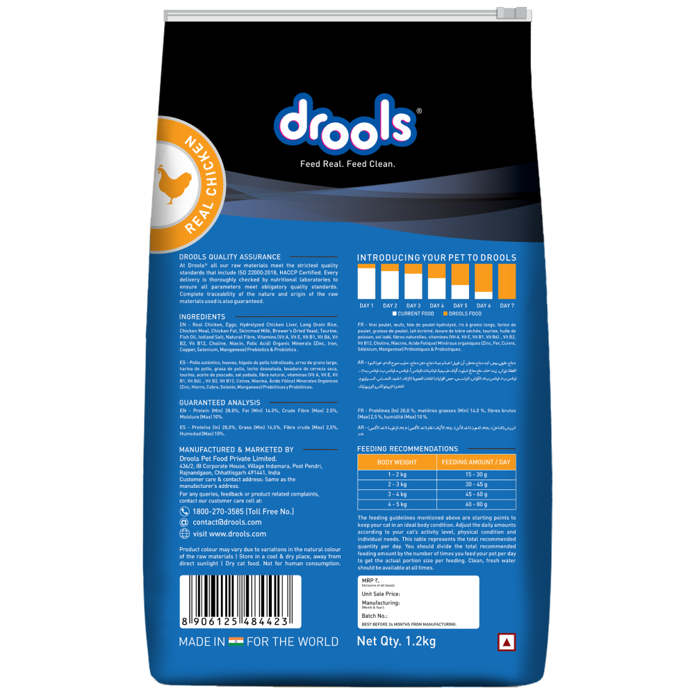 Give your feline friend the ultimate nourishment with Drools Real Chicken Adult Cat Dry Food. Crafted for the well-being of adult cats, this premium dry food combines the best of real chicken, eggs, and hydrolyzed chicken liver to create a nutritious and delicious meal. Packed with essential nutrients and high-quality ingredients, it supports optimal health, energy, and vitality, making it the perfect choice for maintaining your cat's overall wellness.