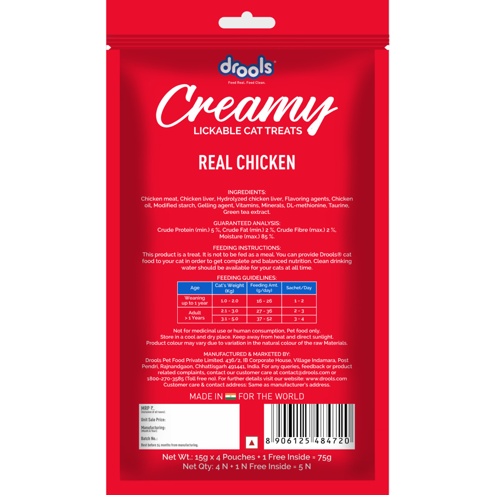 Drools Real Chicken Cat Creamy treats are nutritious, flavourful and pure treats that your cat will find irresistible.