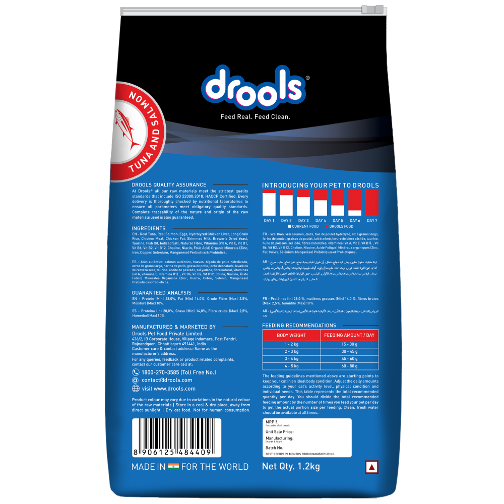 Drools Tuna & Salmon Adult Dry Cat Food is a premium quality meal designed to meet the nutritional needs of adult cats. Formulated with high-quality tuna and salmon, this cat food provides a balanced diet to support your cat's overall health and vitality. Rich in essential nutrients, this food for adult cats ensures your feline friend enjoys every bite while maintaining optimal health.