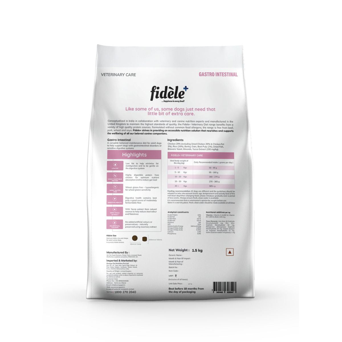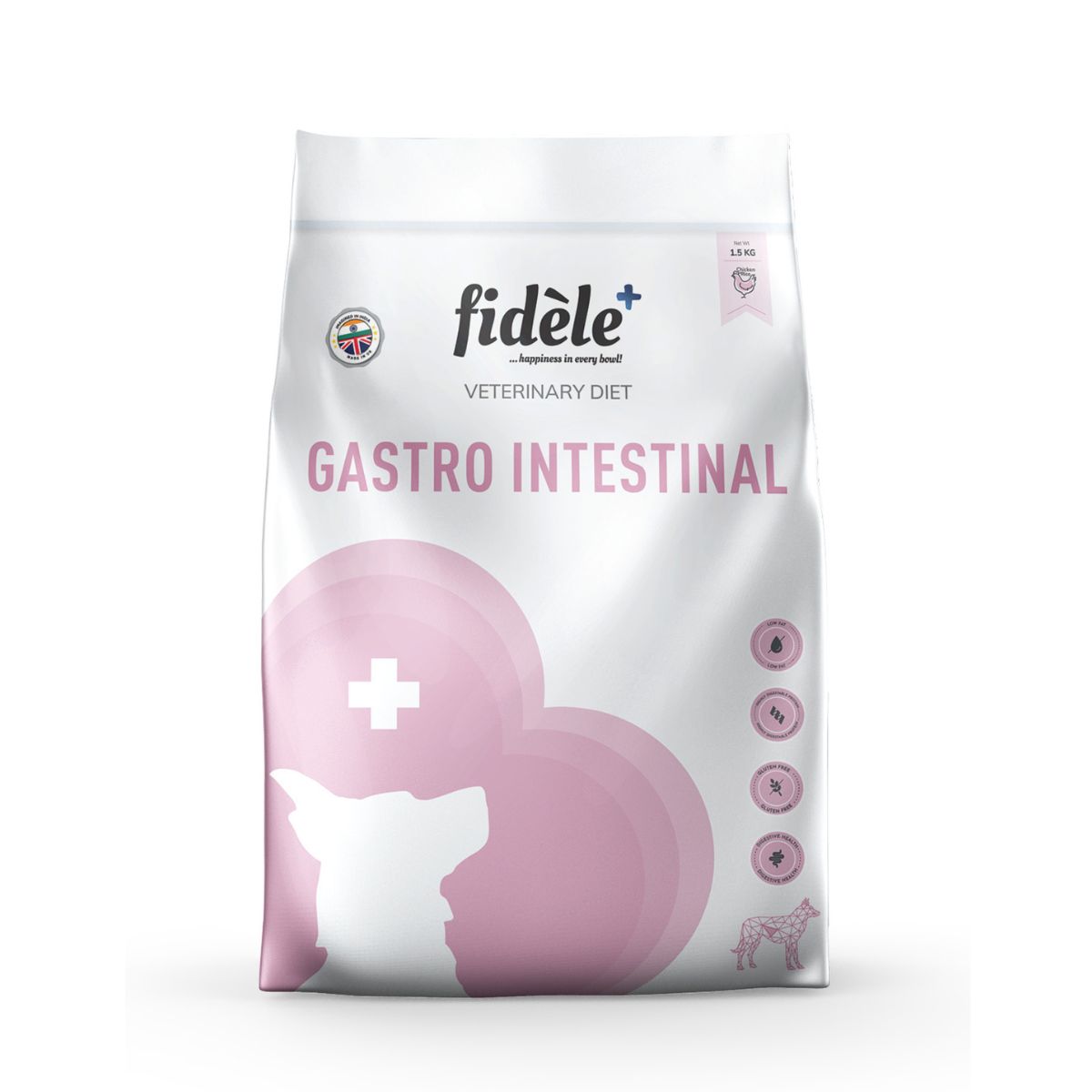 Fidele+ Veterinary Gastrointestinal Diet is a complete balanced maintenance diet to help support dogs with gastrointestinal disorders or sensitive digestive systems.