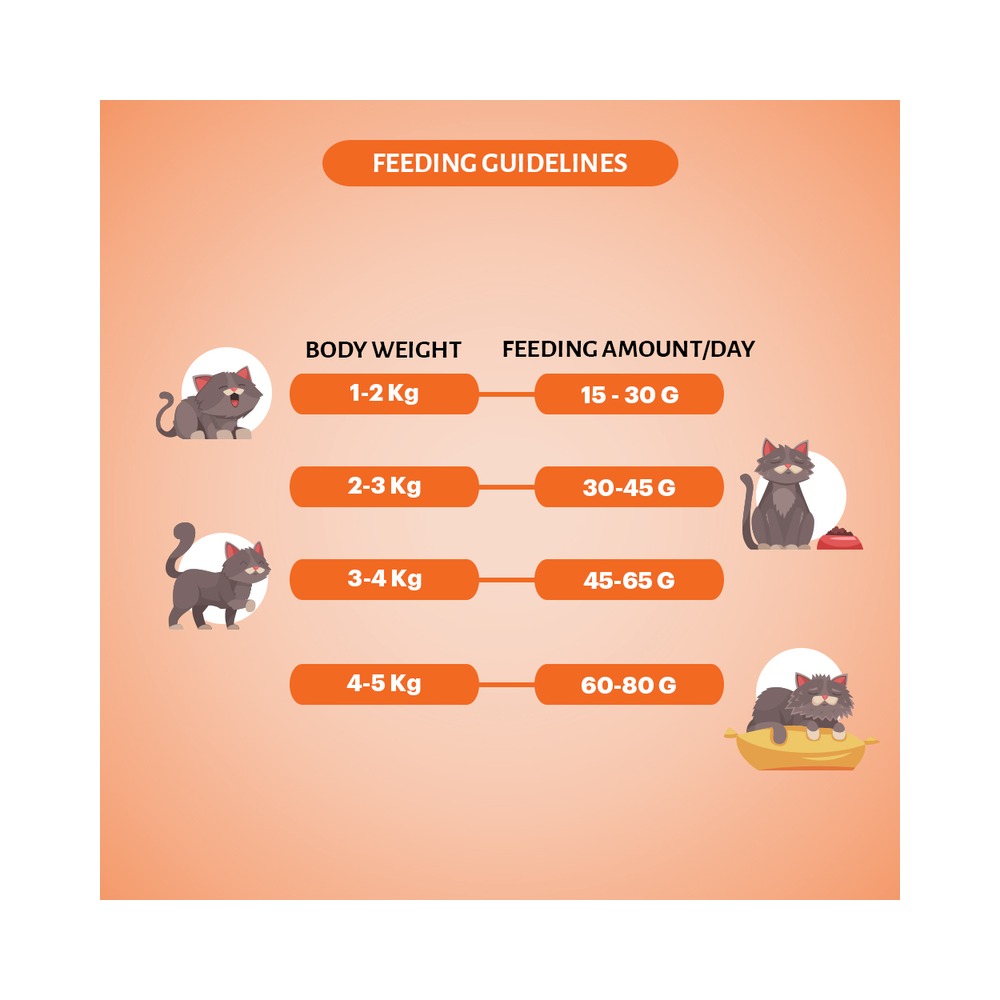 The feeding guidelines mentioned on the pack are the starting points to keep your cat in an ideal body condition. Adjust the daily feeding amounts based on age, physical condition and activity level