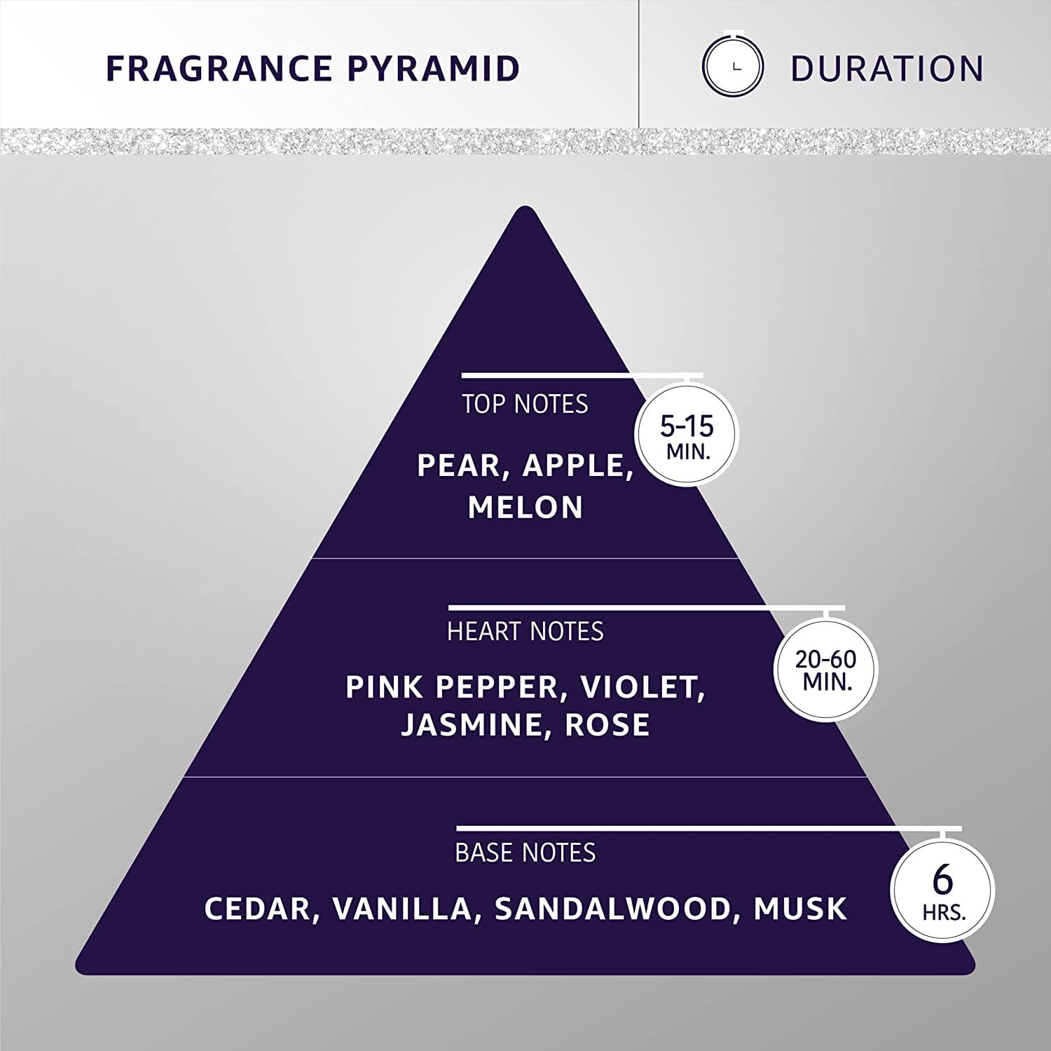 Floral fragrance, with notes of Pear, Citric Notes, Rose, and Sandalwood. Dry touch formula that absorbs