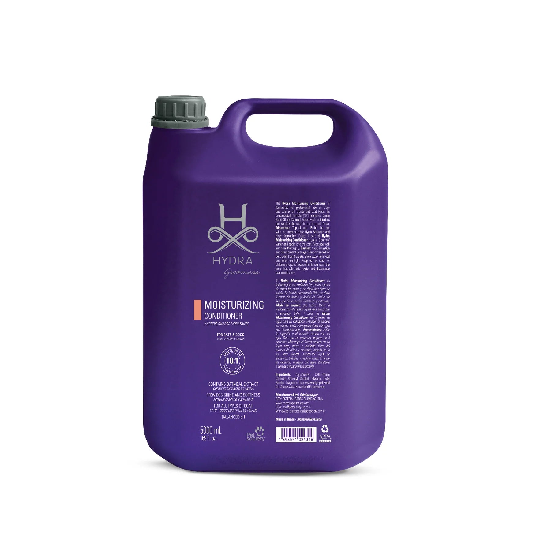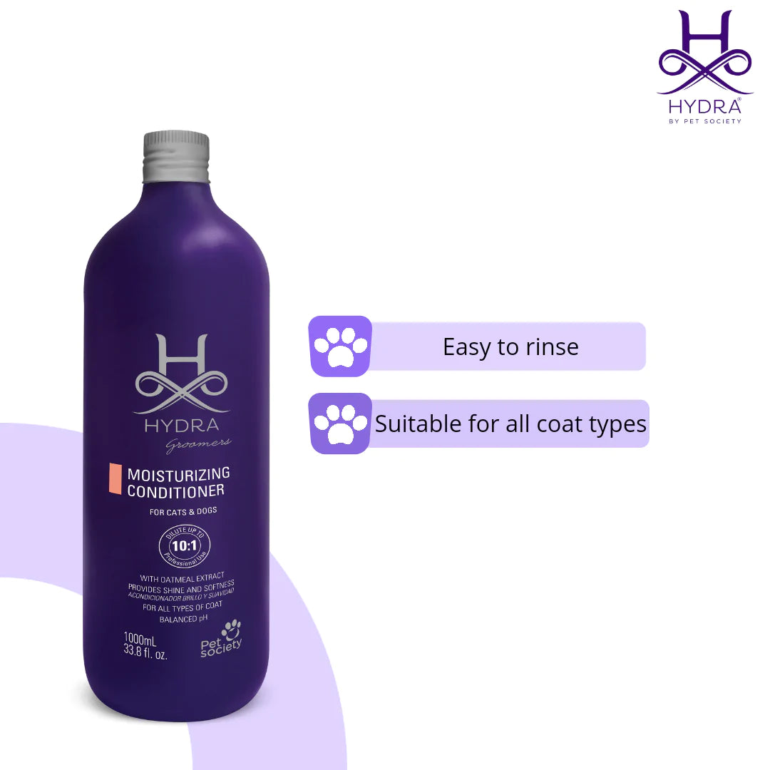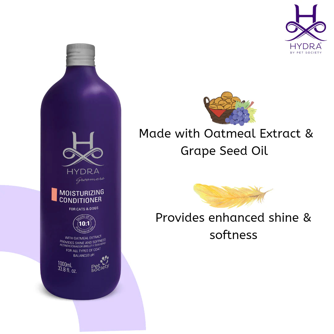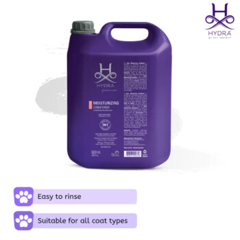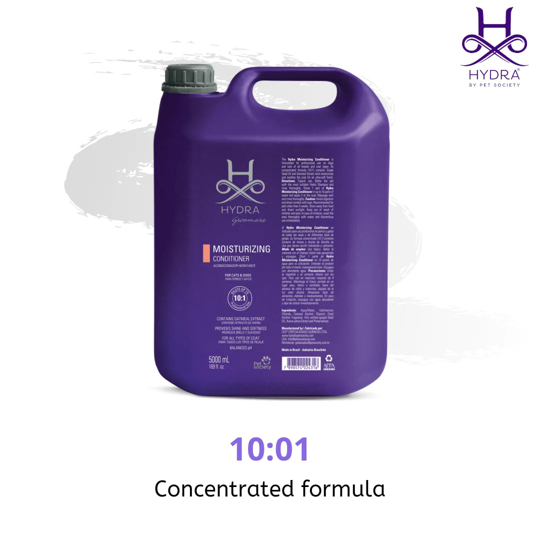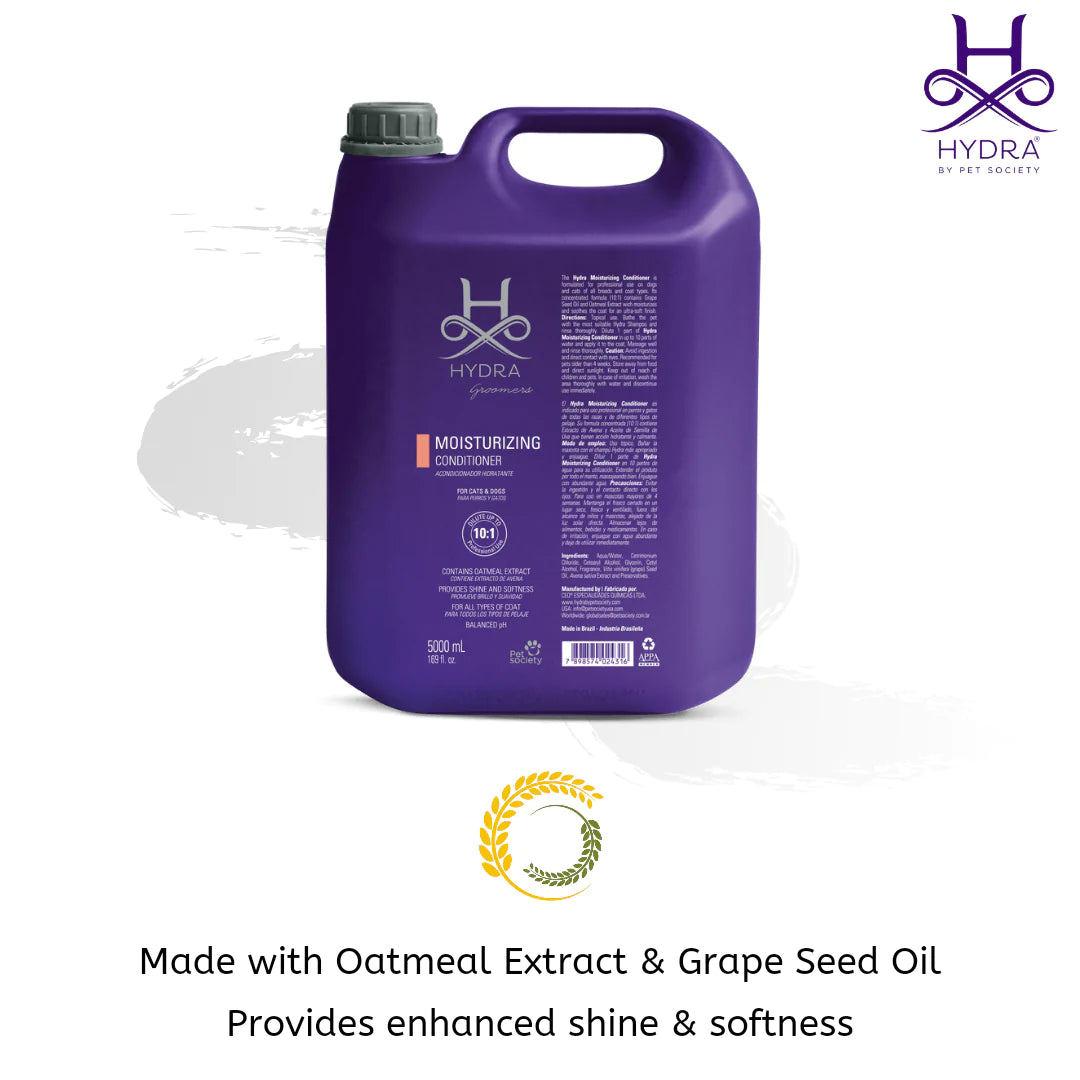 The Hydra Moisturizing Conditioner is ideal for daily use in the professional grooming salon or groomers and handlers competing. The signature fragrance and ultra-hydrating formula assists in promoting healthy coat growth, enhancing natural shine, assisting in the removal of dead undercoat, and soothing dry itchy skin. The Hydra Moisturizing Conditioner is formulated for professional use on both dogs and cats and contains grape seed oil and oat extract to moisturize and soothe the skin and coat while providing shine and softness. The unique properties of this conditioner make it easier to rinse and allow for faster drying of the coat. This is a professional product designed by groomers for groomers and is suitable for all breeds of dogs and cats.