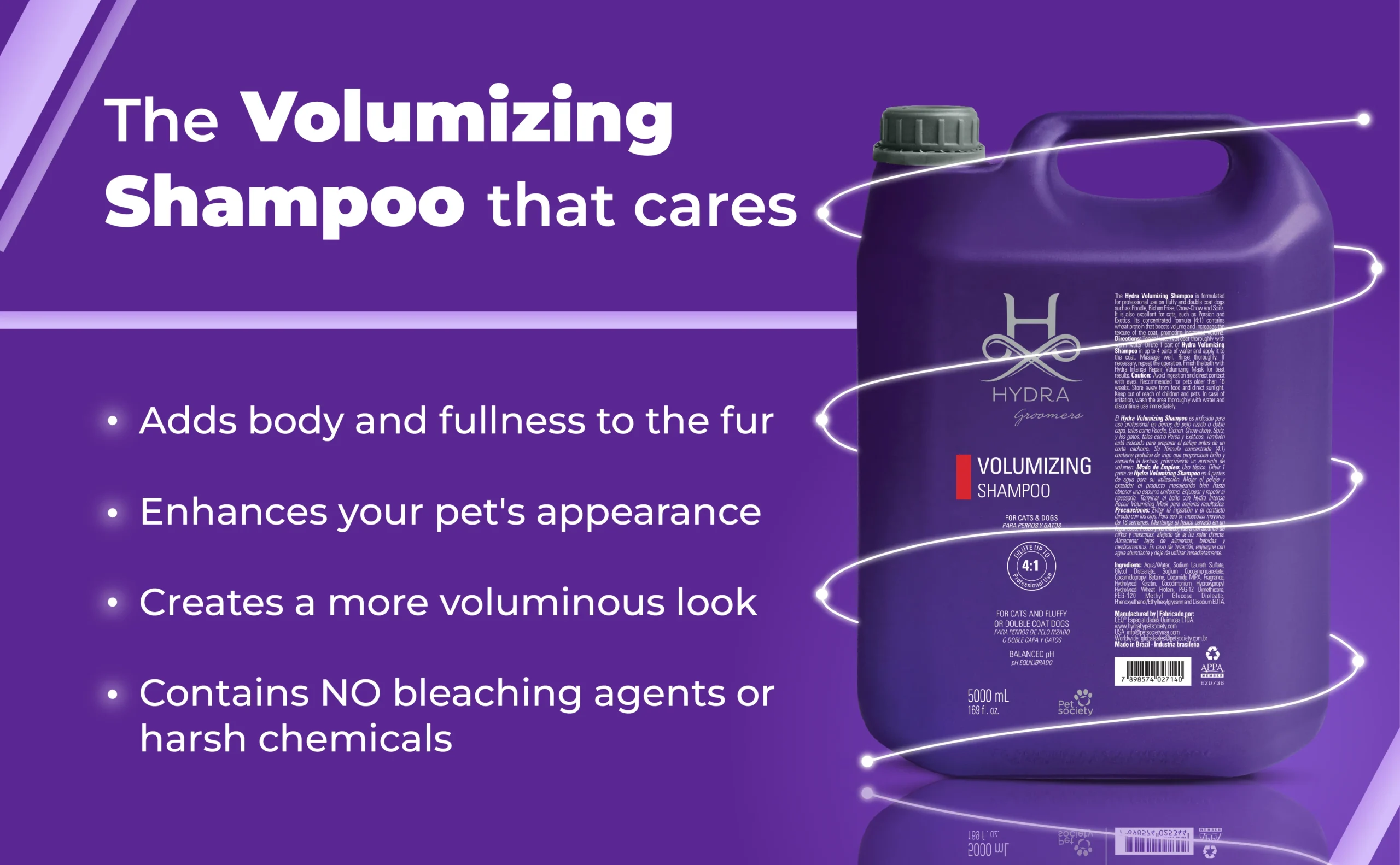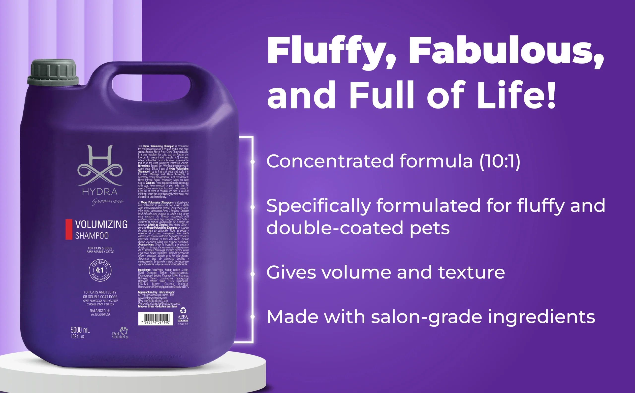 Hydra Professional Shampoos are every Pet Professional’s Absolute Choice, Infused with Salon–Grade Ingredients to experience a luxurious grooming experience for every pet & pet professional. Hydra Volumizing Shampoo is made for professional use on dense and curly coat types such as Poodles, Bichon Frisés, Chow-Chows, and Spitz. This shampoo is also excellent to use on cats such as Persians and Exotics. The concentrated formula contains keratin and wheat proteins to boost volume and increase the texture of the coats. This is a professional shampoo designed by groomers for groomers and is suitable for all breeds of dogs and cats.