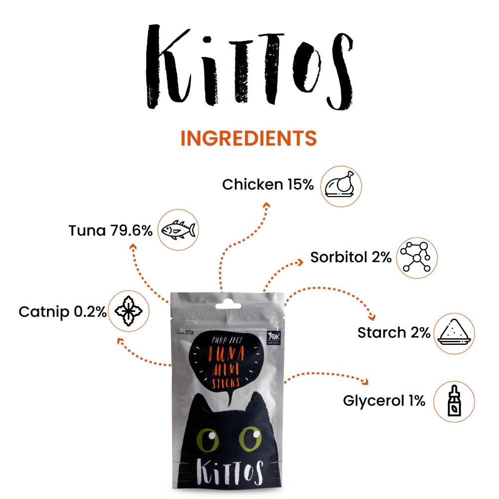 Kittos cat treats are packed with protein to provide a pure, tasty and highly digestible snacks. Kittos are delicious treats to keep your cat happy and healthy.