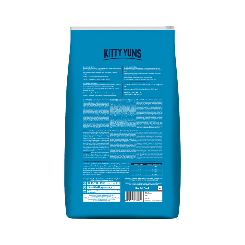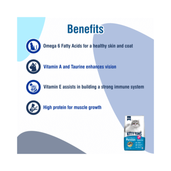 Kitty Yums is a unique cat food recipe specially designed to cater to the nutrional of Persian Cats. It is formulated with high quality ocean fish, such as sardines and mackerel. This meal with more meat and less grain provides your cats with higher level of protein for stronger, bones and muscles. Enriched with omega fatty acids, taurine, prebiotics, probiotics and calcium supports the complete growing needs and overall vital system of your cat. With no soy, corn or wheat, it is a complete and balanced meal to nourish your pet cat. The natural fibre blend helps minimise the formation of hairballs and the added Omega 6 gives a radiant coat and healthy skin, just the perfect combination for your Persian cat.