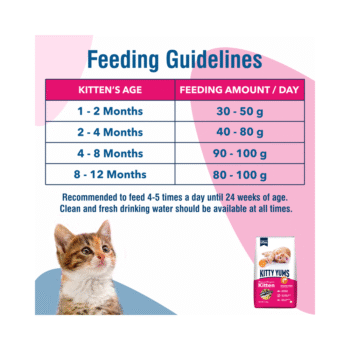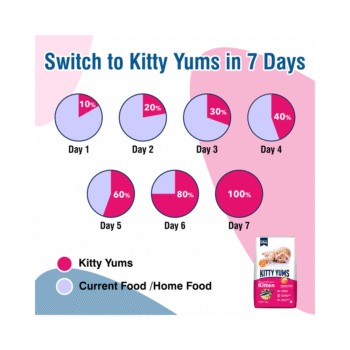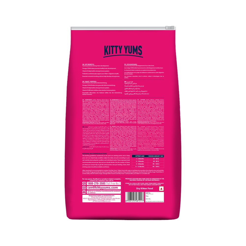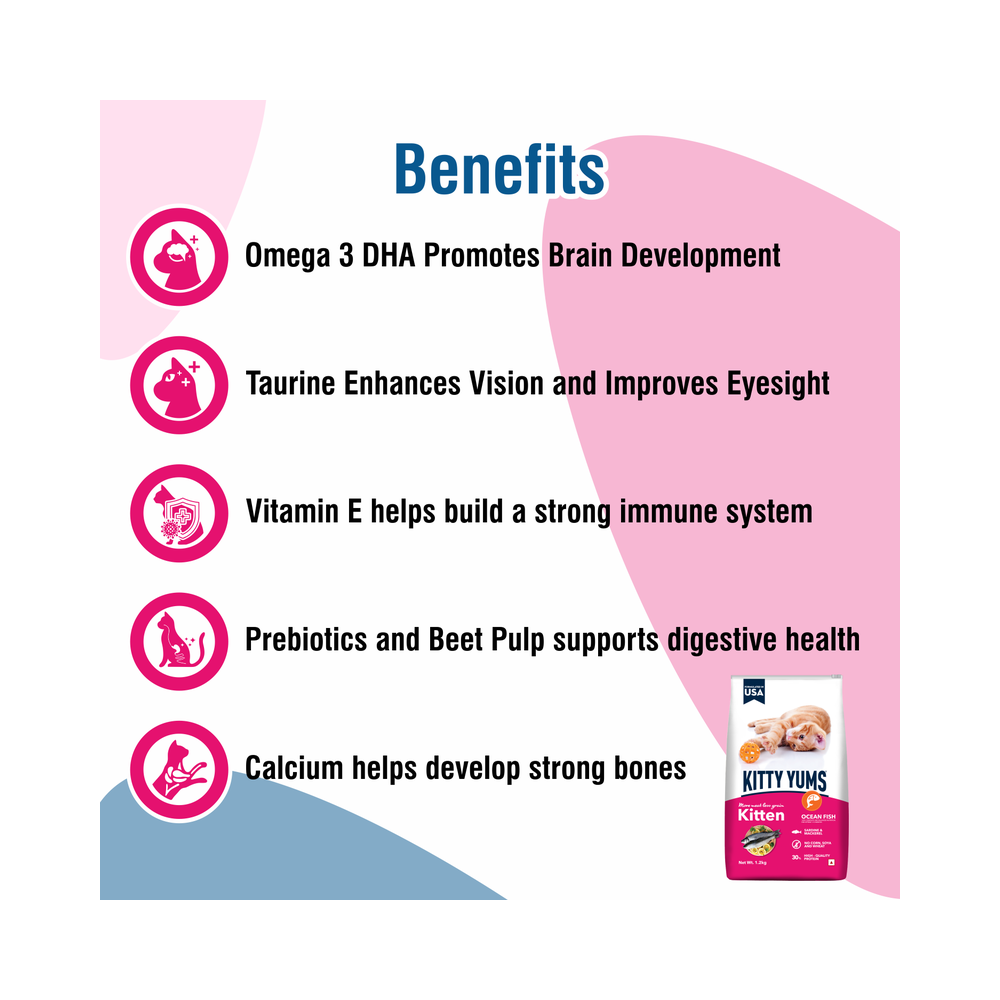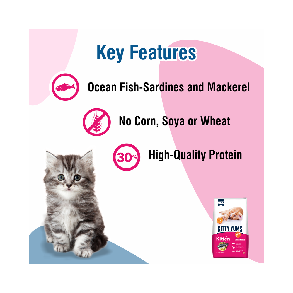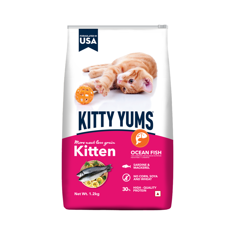 Kitty Yums is a unique kitten food recipe formulated with high quality ocean fish, such as sardines and mackerel. This meal with more meat and less grain provides your cats with higher level of protein for stronger, bones and muscles. Enriched with omega fatty acids, taurine, prebiotics, probiotics and calcium supports the complete growing needs and overall vital system of your kitten. With no soy, corn or wheat, it is a complete and balanced meal to nourish your pet kitten.
