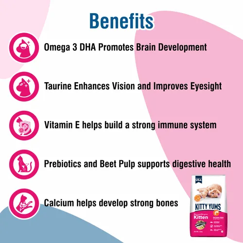 Taurine Promotes Strong Vision Development Omega 3 DHA Helps Promote Healthy Brain Development Vitamin E Helps Build A Strong Immune System Prebiotics And Beet Pulp Support Your Kitten's Digestive Health Essential Minerals Including Calcium Help Develop Strong Bones. Kitty Yums Is Formulated In USA.