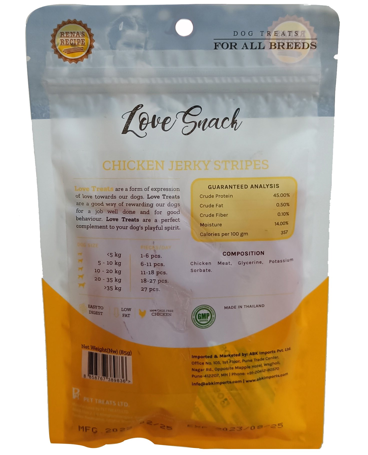 Made from high-quality products; extremely tasty and premium-quality dog treat; highly digestible; rich in protein; contains no artificial flavours or preservatives; packed in an airtight bag to help maintain freshness. Rena's Love Chicken Jerky Strips Puppy & Dog Treat is a delicious and tasty treat that contains highly digestible protein via chicken. It contains up to 70% pure meat that provides high protein and thus provide strong bones and muscles.