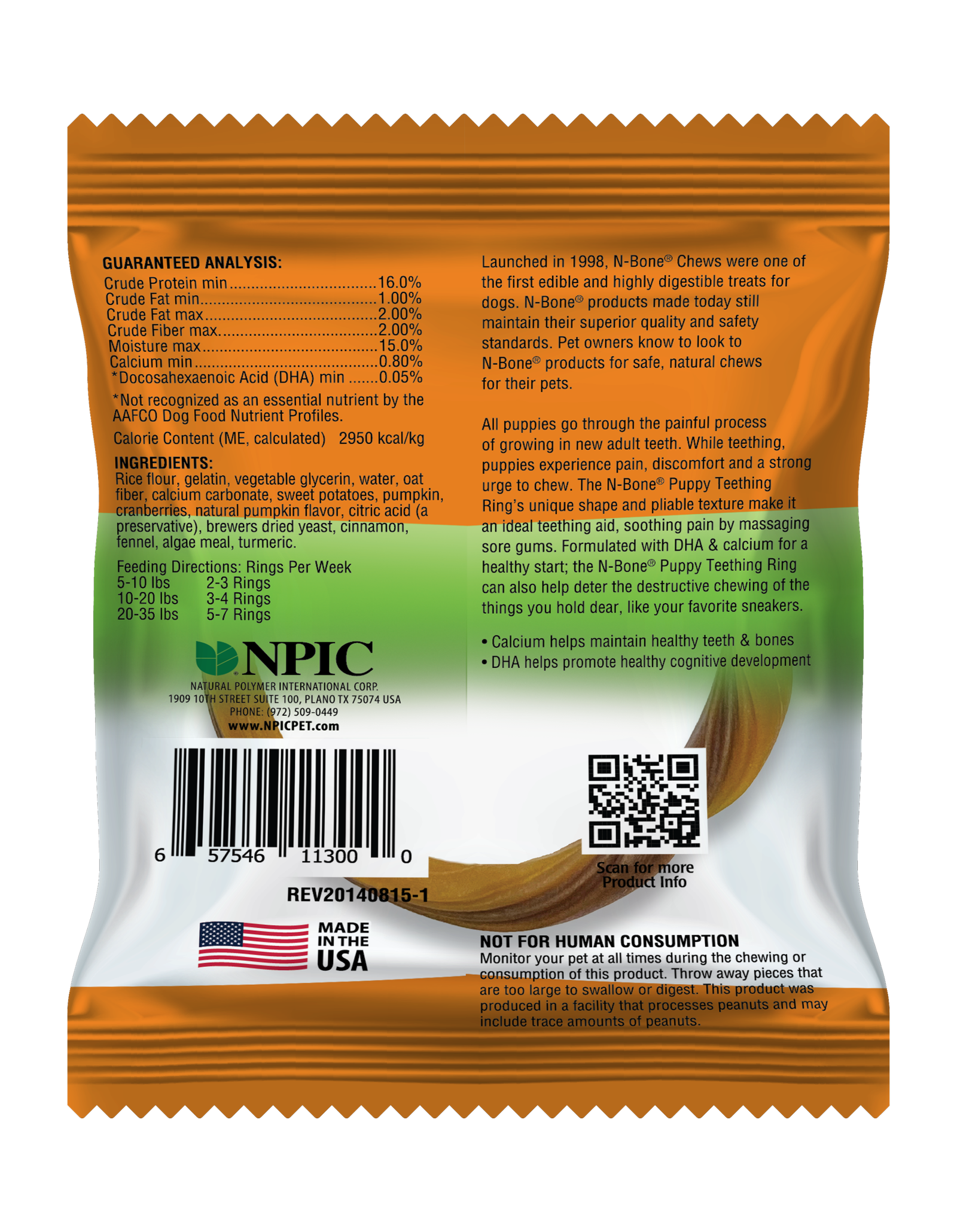 N-Bone Puppy Teething Ring Pumpkin Flavour is a long-lasting chew treat that is perfect for helping with the teething process. It contains DHA and calcium to promote the growth of healthy teeth and bones. Take care of your puppy's teeth by ordering these delicious pumpkin teething rings today! This mouthwatering treat is made to be completely edible to provide a safe chewing experience for your growing puppy.
