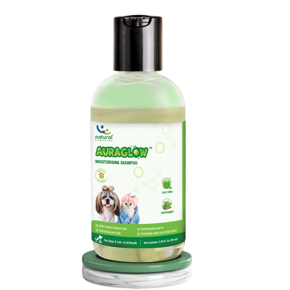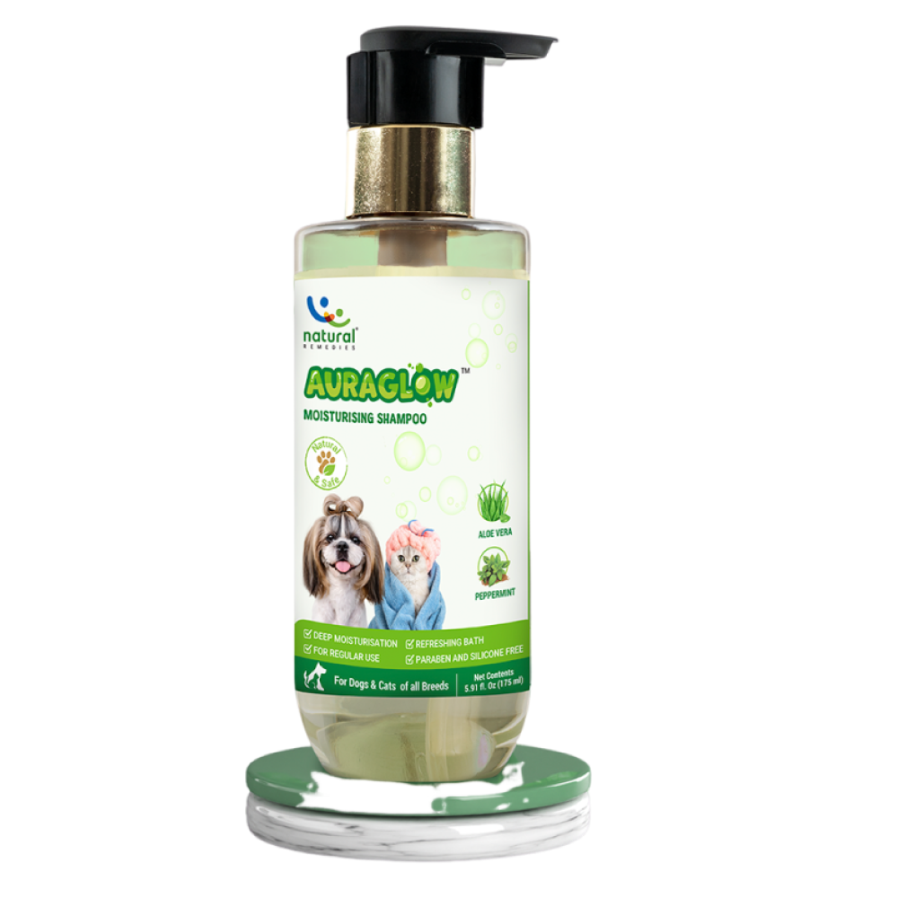 Auraglow Natural Moisturizing Shampoo, infused with Aloe vera and refreshing peppermint, delivers deep hydration and soothing comfort to your pet's coat. Perfect for regular use, it not only moisturizes and conditions but also leaves the coat fresh and vibrant, ensuring a healthy, glossy shine after every wash. Choose from a range of sizes (90 ml, 175 ml, 350 ml) to meet your needs.
