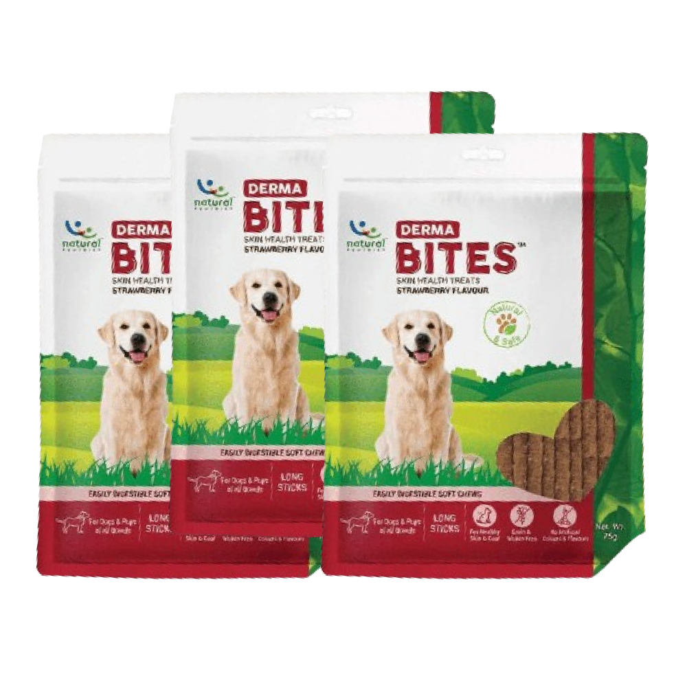 Introducing first of its kind, all-natural, grain-free functional treats. Derma Bites™ helps in improving skin and coat health. The flavours and textures of Derma Bites™ make them very palatable for the pets and is also healthy, so the pet parents can now feed their pets these soft chews without any worries.