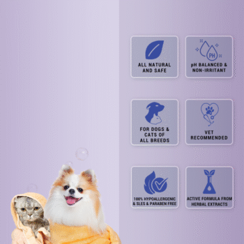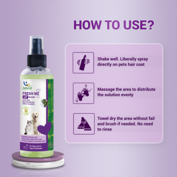 Fresh Me Up Bloom Aloevera is a natural, waterless, hypoallergenic spray cleanser crafted for pets. Enriched with Aloe vera, Allantoin, and Vitamin E, it gently cleanses, moisturizes, and refreshes your pet’s coat without the need for water. Perfect for quick spot cleaning, travel, or pets sensitive to baths, it’s an ideal solution for maintaining hygiene, especially during winter or post-surgery.