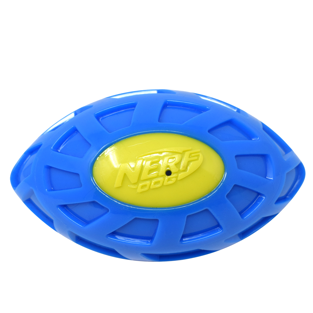 The 5in TPR EXO Micro Squeak Football is perfect for small to medium dogs that love squeaky toys. Its bouncy design and durable material make it great for fetch and solo play.