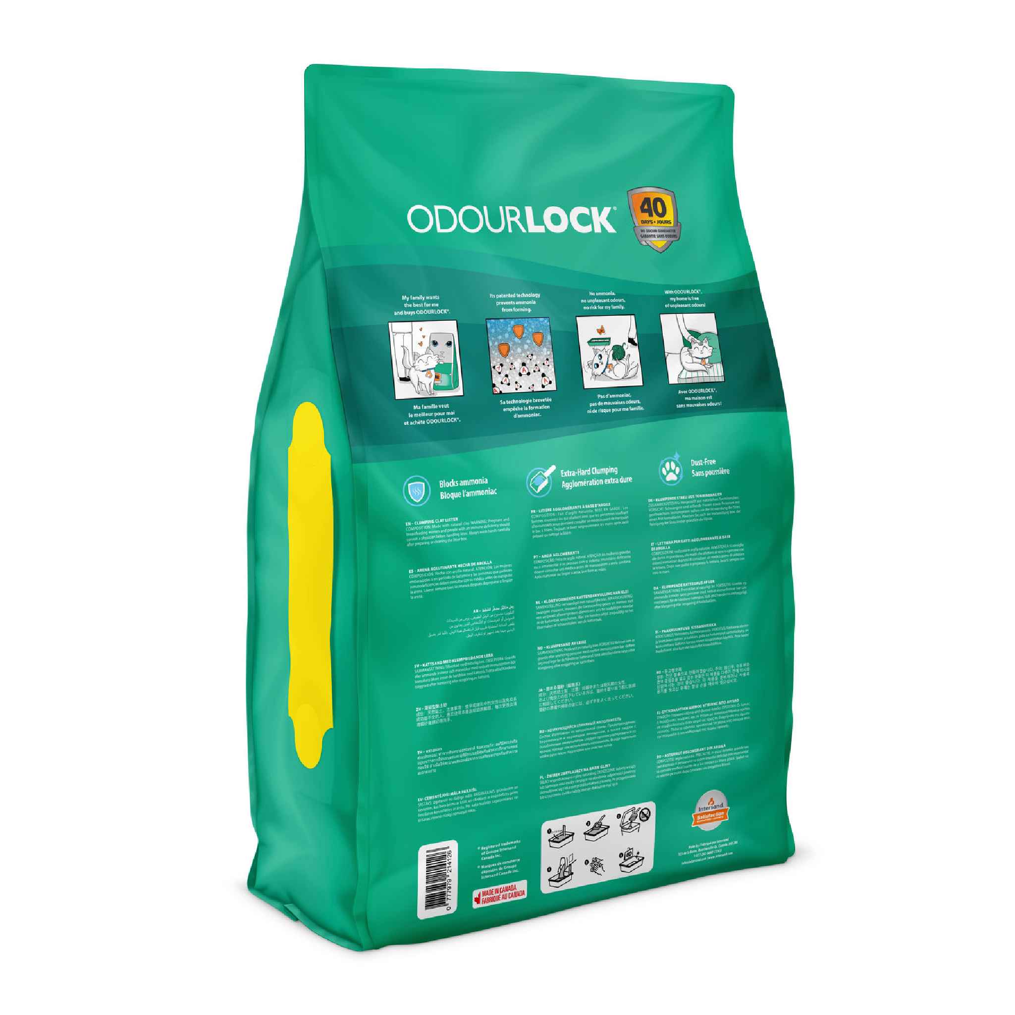 OdourLock litter neutralizes ammonia formation for unparalleled control of urine and feces odours. Cat urine does not contain ammonia per se; rather, it is formed in the litter box when the urine comes into contact with oxygen and develops bacteria. Ammonia is responsible for the unpleasant smell that comes from the litter box. Our technology is activated when it comes into contact with urine to neutralize odours for more than 40 days. OdourLock is perfect for a multi-cat environment: Just scoop once a day for optimal cleanliness that will delight you and your cats!