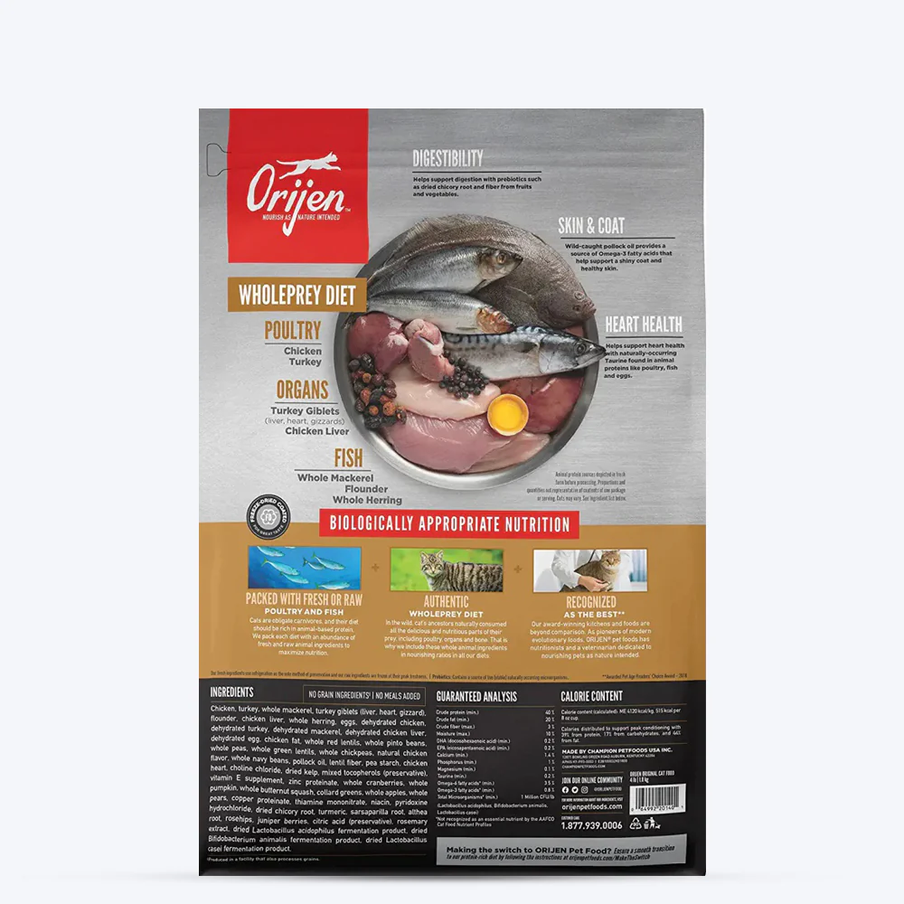 Help your cat thrive with the power of protein-rich recipes that provide peak nourishment. As obligate carnivores, modern cats are built like their ancestors and thrive on a Biologically Appropriate diet rich in protein and fat sourced from a variety of animal ingredients. ORIJEN Original Cat diet is made with fresh or raw free-run chicken and turkey, wild-caught fish, and cage-free eggs. Packed with Whole Prey animal ingredients like organs and bone, ORIJEN food is made with the most nutrient-dense, succulent parts of the prey to deliver the nutrition cats need. With 90% quality animal ingredients and a freeze-dried liver coating, this diet is beyond comparison.