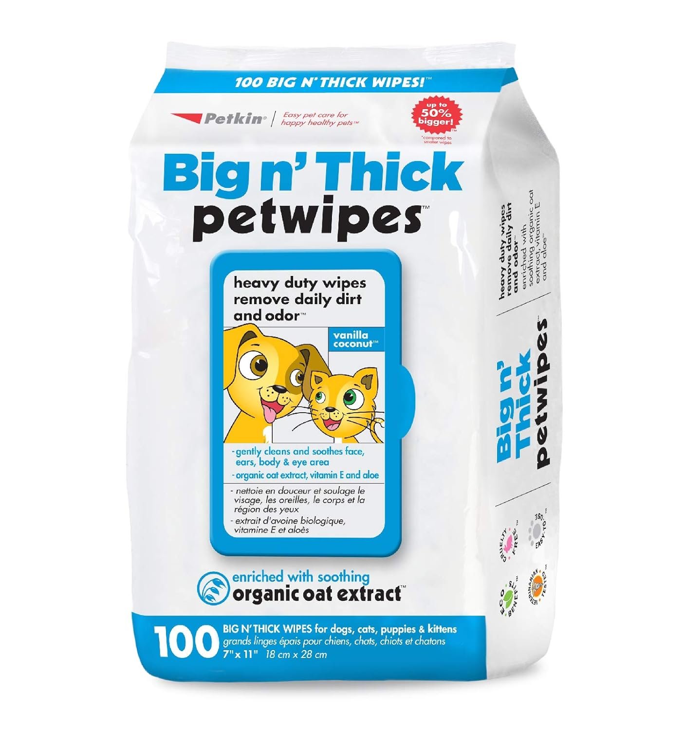 Fast, convenient way to keep pets clean everyday. Each big & thick, heavy duty wipe is moistened with a gentle cleansing formula. Wipes away daily dirt & ordour. Won't remove spot flea treatments. Contains aloe & lanolin, Vitamins A & E, protien.