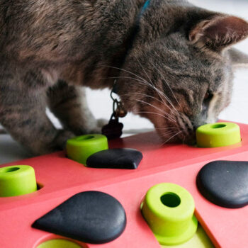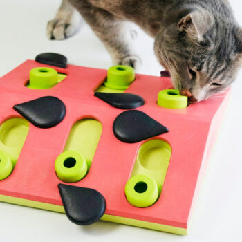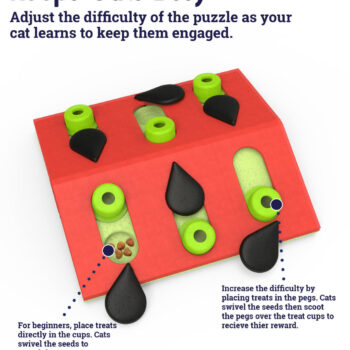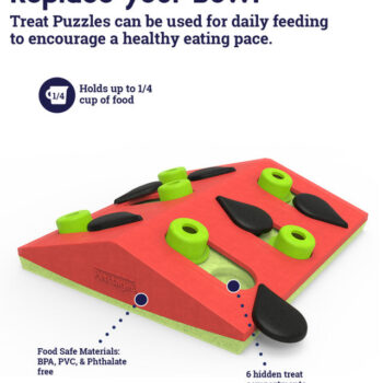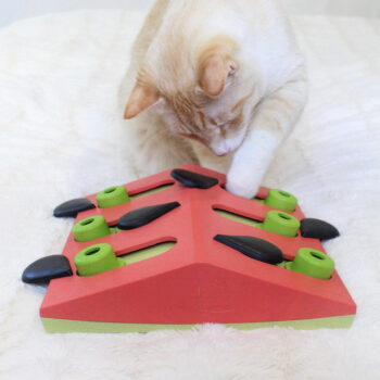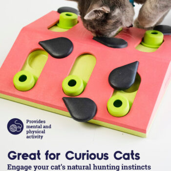 Your smarty cats will love the challenge of the Melon Madness Puzzle & Play by Nina Ottosson. Cats bat at the pegs and swivel the seeds to uncover the 12 hidden treat compartments. Adjust the difficulty of the puzzle to make it easier for beginners or more challenging for super smarty cats. Each puzzle comes with a Tips and Tricks info sheet to help you get the most out of your puzzle. Replace your standard bowl and feed your cat from the puzzle to engage their natural hunting and foraging instincts. The puzzle holds up to 1/4th cup of food, and is made with food safe materials that you can trust with your kitty.