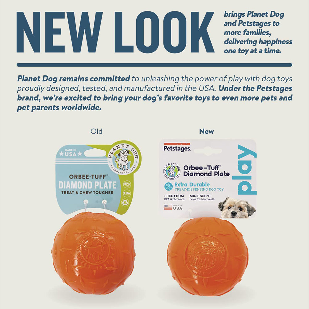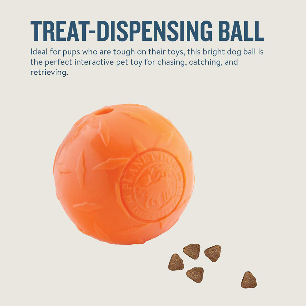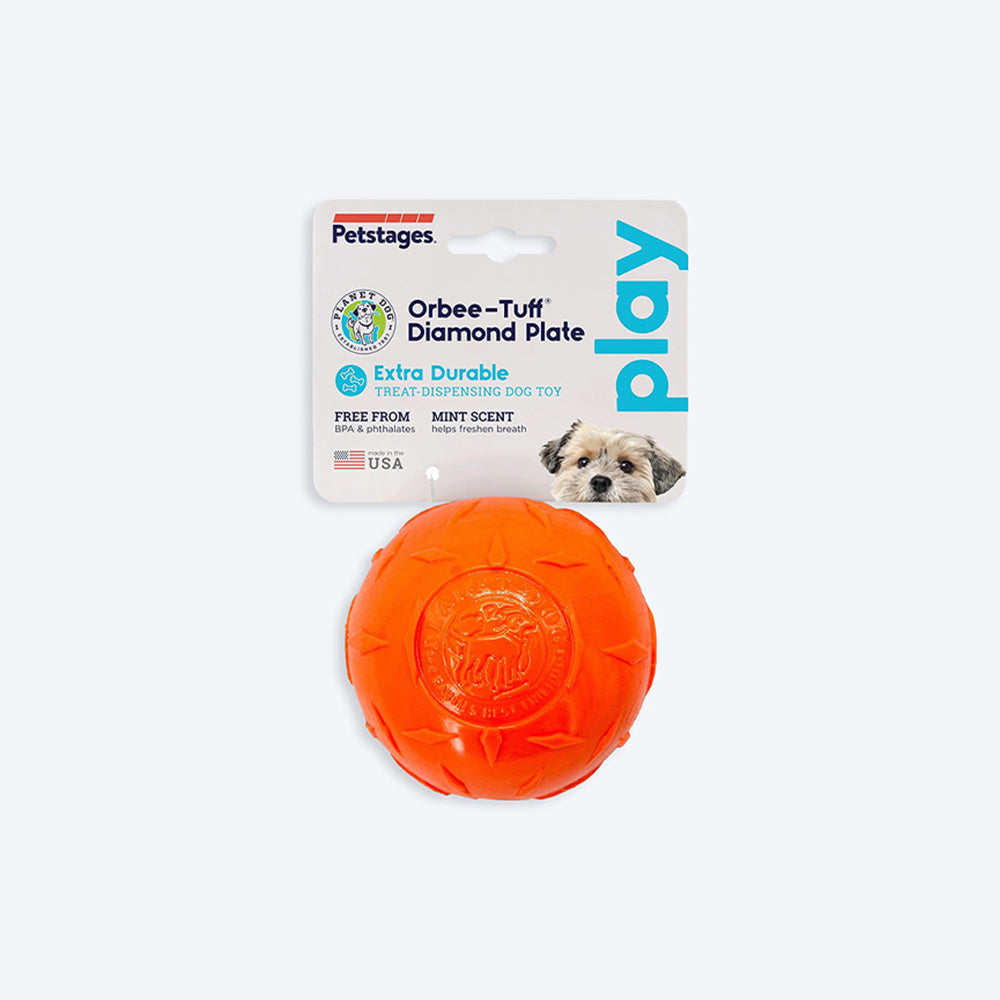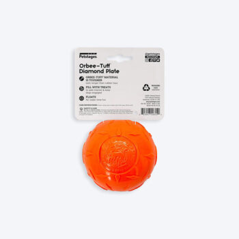 The Orbee-Tuff Diamond Plate dog ball from Planet Dog is the toughest Orbee-Tuff toy ever made and is ideal for dogs that like to chew. food-grade TPE rubber that is free of BPA, lead, and phthalates, this treat-dispensing dog fetch toy is guaranteed to please. This dog toy is buoyant and durable enough to withstand hours of playtime spent chasing, catching, and fetching. Fill the dog toy's small opening with treats and roll it towards your dog to reward them for good behaviour.