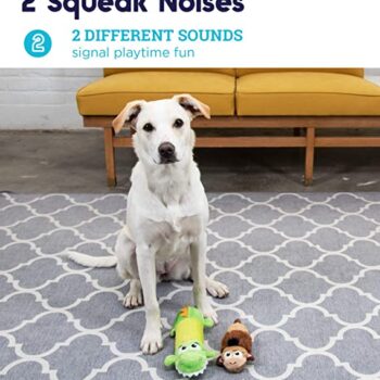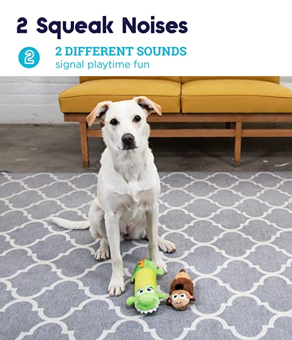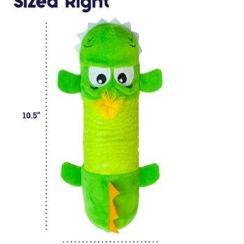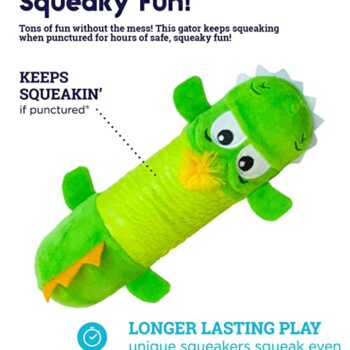 This dog toy contains no stuffing for your pet to ingest. It has a tough middle to help keep its shape, even if it is punctured. The double squeakers make different sounds to grab your dog's attention. The different textures will keep your dog's interest longer. The Big Squeak Gator is the appropriate size for medium to large breed dogs.