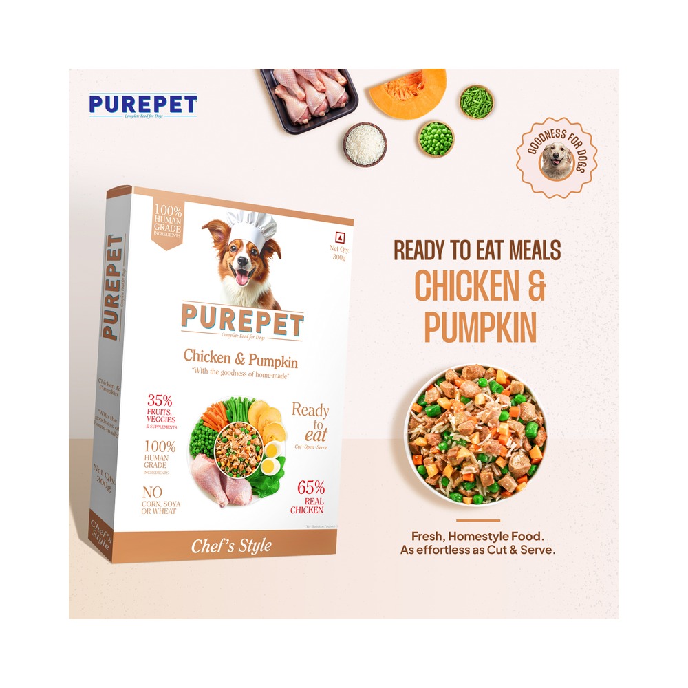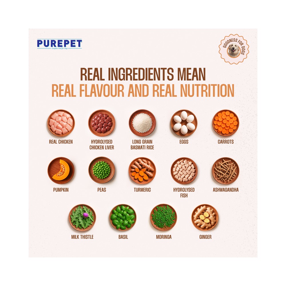 Real Chicken, Eggs, Hydrolysed Chicken Liver, Carrots, Pumpkins, Peas, Spinach, Apples, Coconut Oil, Ashwagandha, Basil, Moringa, Amla, Turmeric, Ginger, Milk Thistle, Giloy, Organic Minerals & Vitamins (Vit E, Vit A, Vit C, Vit D3, Vit B1, Vit B2, Vit B6, Choline, Folic Acid)
