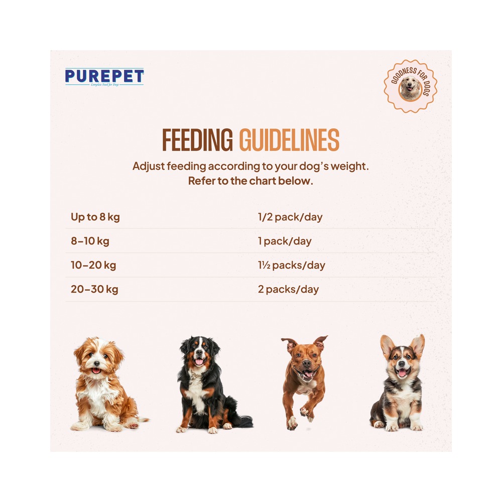 The daily feeding quantity varies according to the age, activity, size and temperament of your dog. You can serve your pet with recommended amount by dividing it with number of times you feed daily.