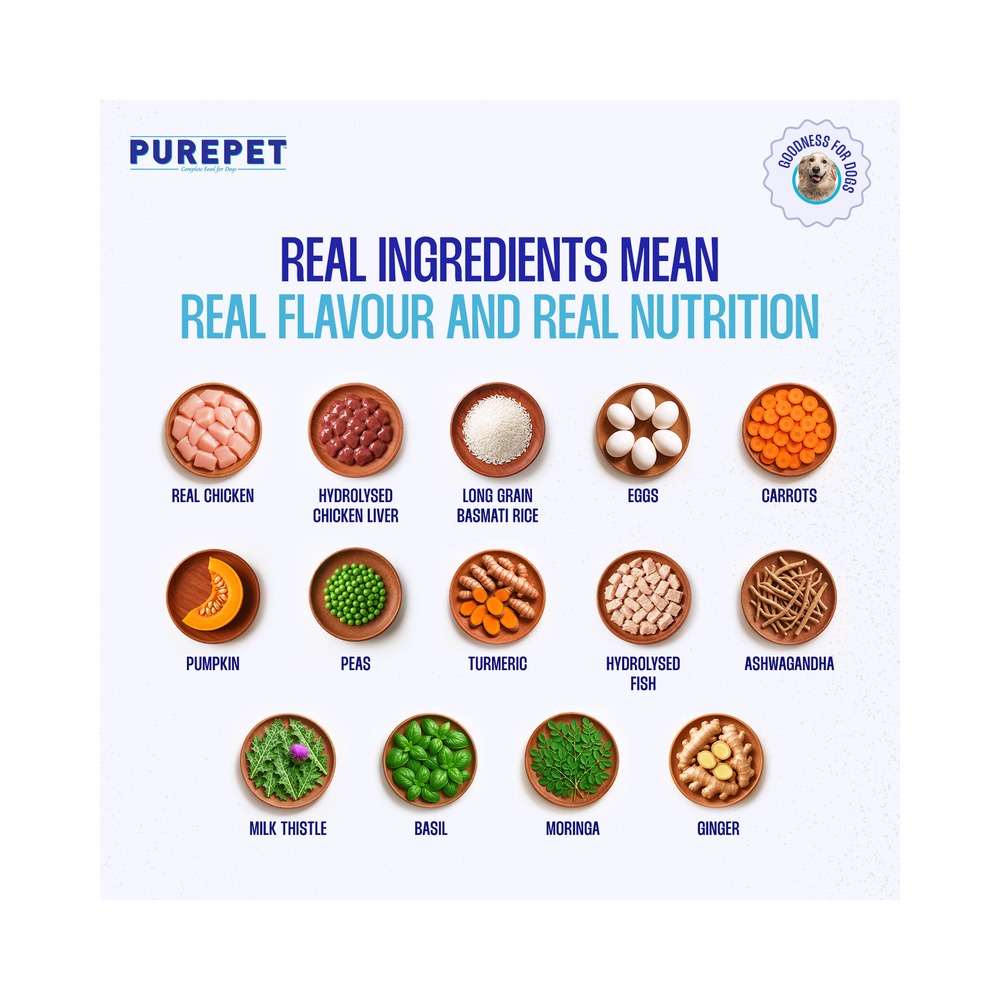 Real Chicken, Eggs, Hydrolysed Chicken Liver, Carrots, Pumpkins, Peas, Spinach, Apples, Coconut Oil, Ashwagandha, Basil, Moringa, Amla, Turmeric, Ginger, Milk Thistle, Giloy, Organic Minerals & Vitamins (Vit E, Vit A, Vit C, Vit D3, Vit B1, Vit B2, Vit B6, Choline, Folic Acid)