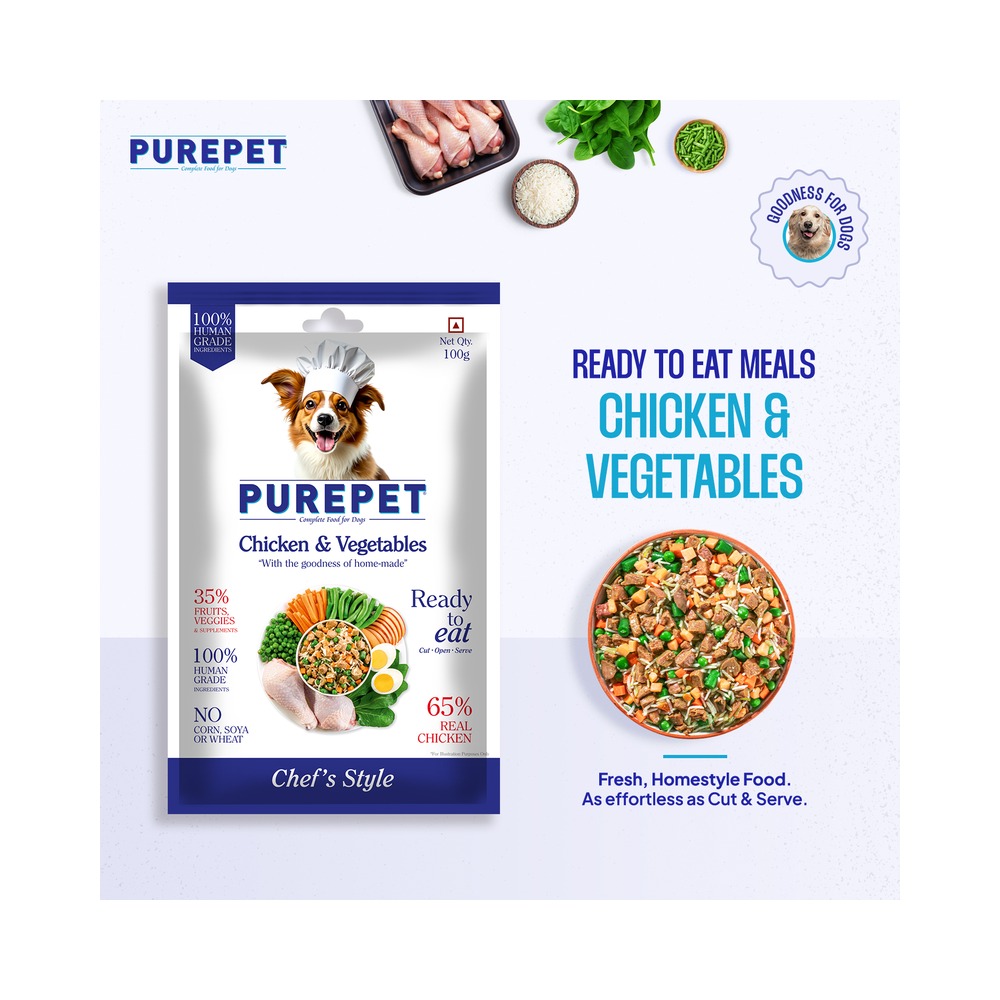 Real Chicken, Eggs, Hydrolysed Chicken Liver, Carrots, Pumpkins, Peas, Spinach, Apples, Coconut Oil, Ashwagandha, Basil, Moringa, Amla, Turmeric, Ginger, Milk Thistle, Giloy, Organic Minerals & Vitamins (Vit E, Vit A, Vit C, Vit D3, Vit B1, Vit B2, Vit B6, Choline, Folic Acid)