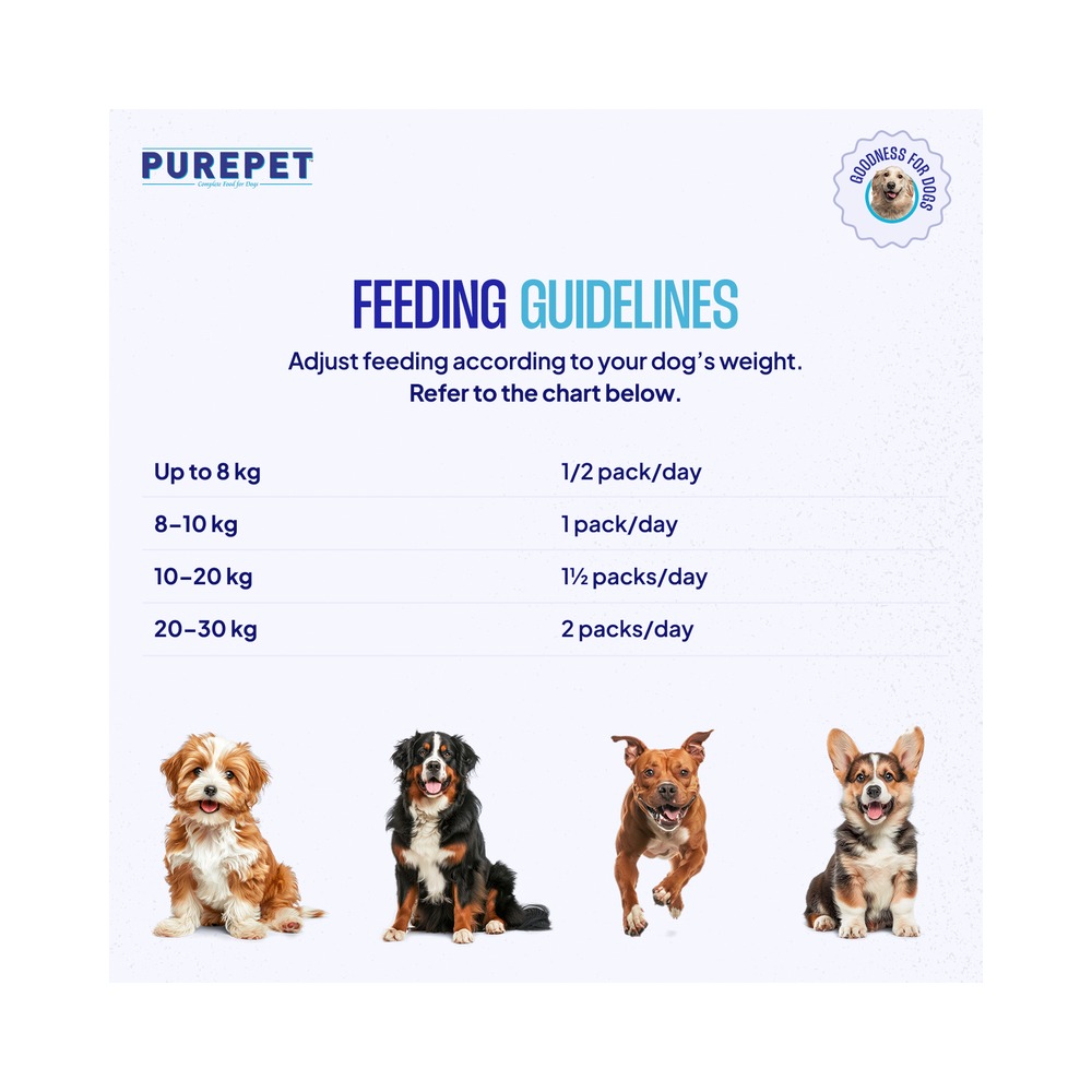 The daily feeding quantity varies according to the age, activity, size and temperament of your dog. You can serve your pet with recommended amount by dividing it with number of times you feed daily.