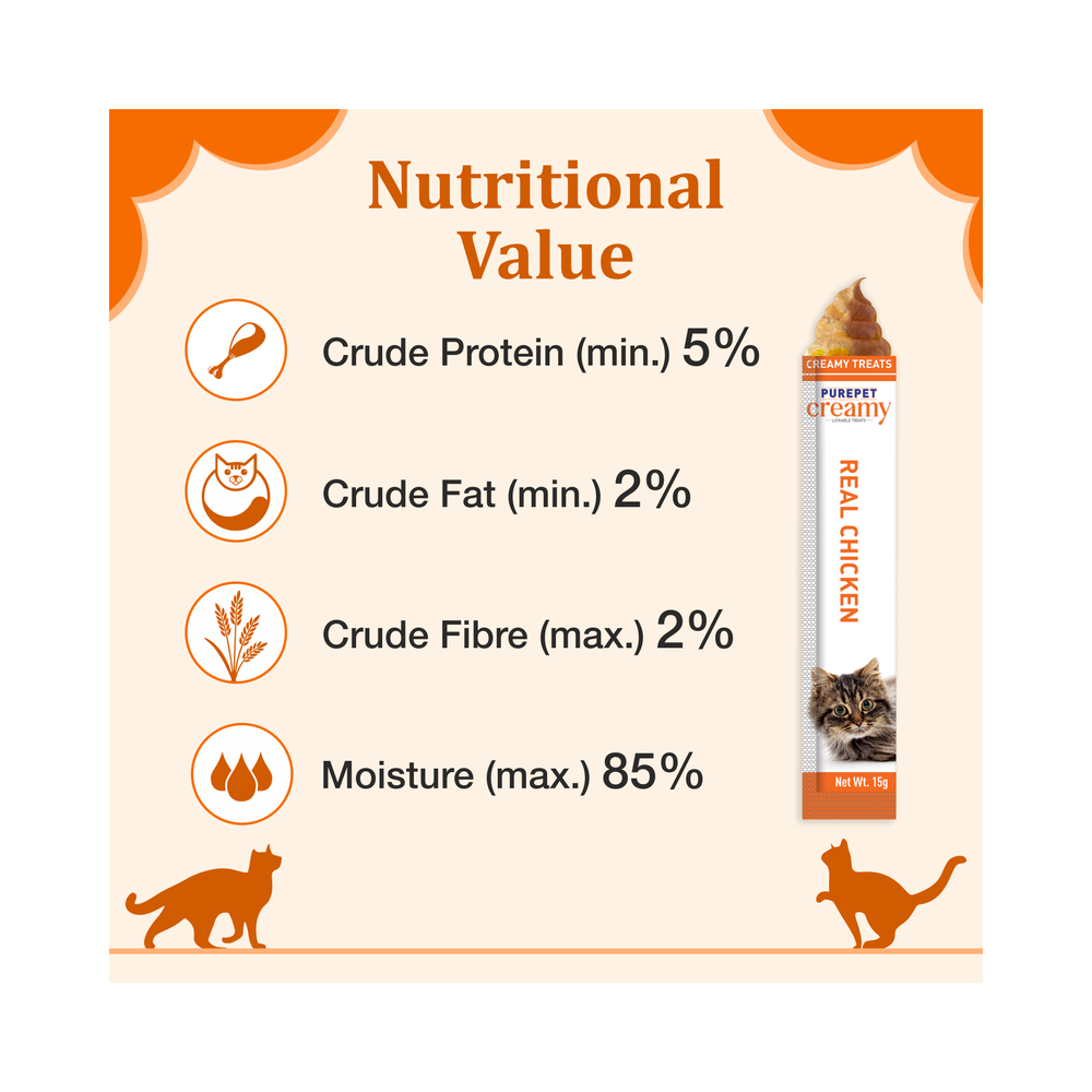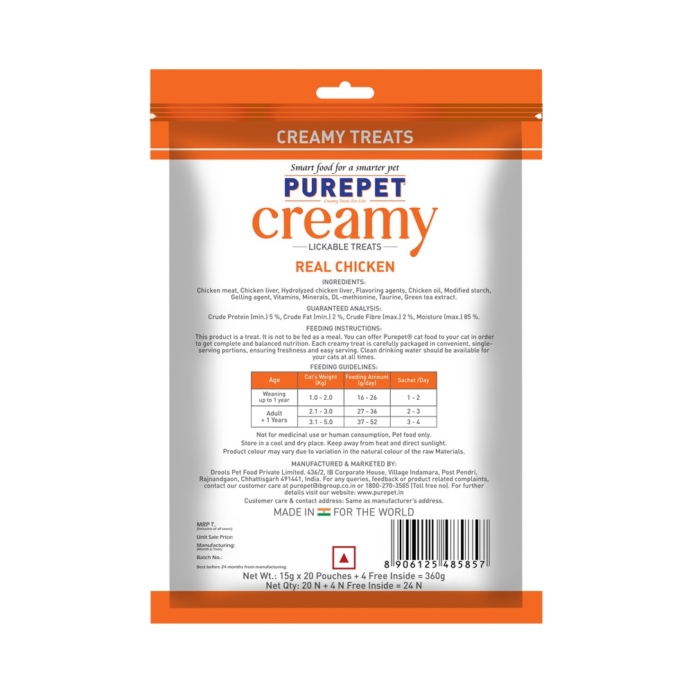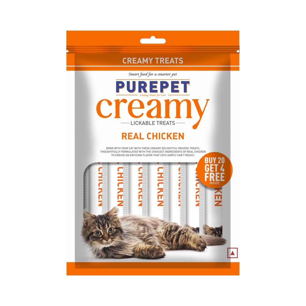 Purepet Creamy Lickable Cat Treats,Real Chicken (15g x24 Pcs) 360Gm | Rich In Protein | Taurine For Heart & Vision | Ideal For Training And Bonding | Promotes Hydration | No Artificial Preservatives | Treats For Kitten And Adult Cats