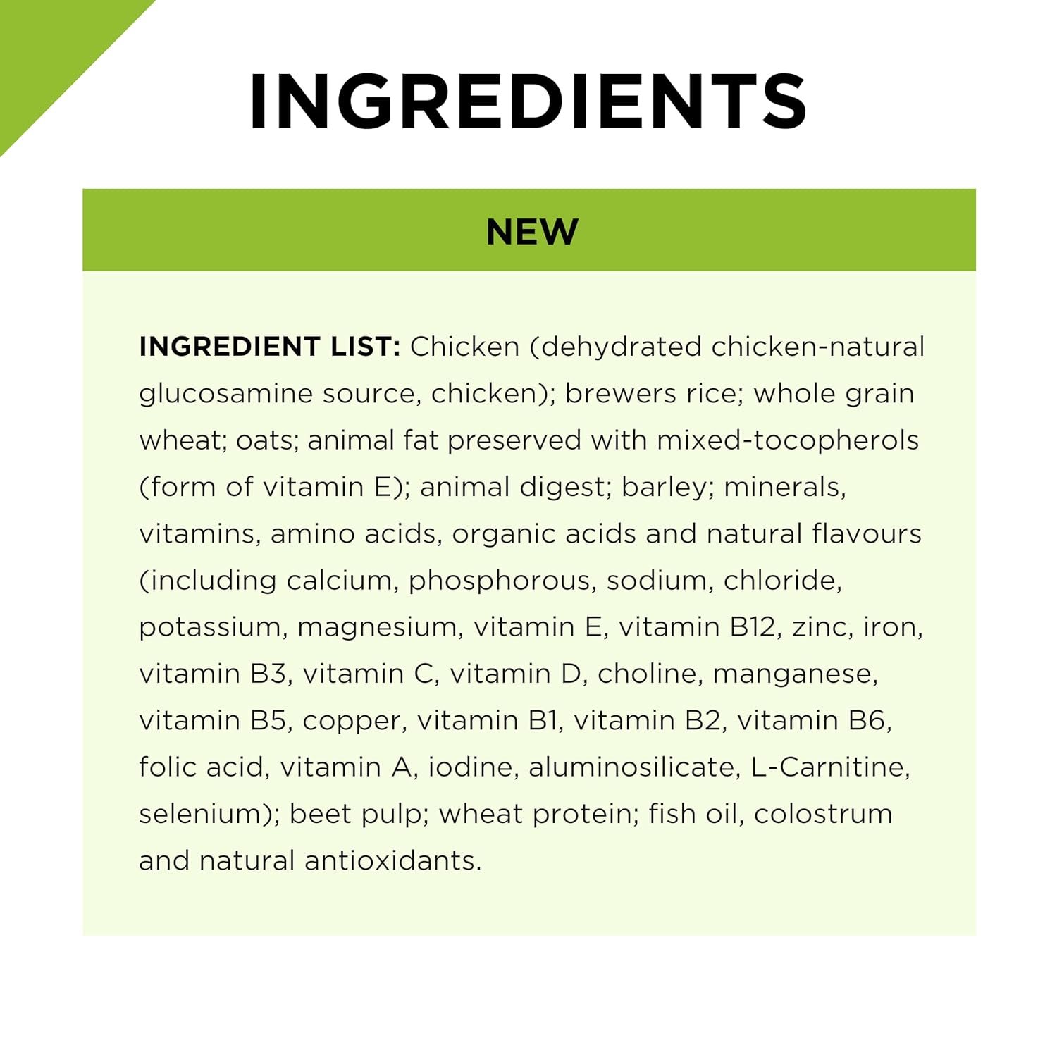 Special Ingredients Chicken (dehydrated chicken-natural glucosamine source, chicken); brewers rice; whole grain wheat; oats; animal fat preserved with mixed-tocopherols (form of vitamin ); animal digest; barley; minerals, vitamins, amino acids, organic acids and natural flavours (including calcium, phosphorous, sodium, chloride, potassium, magnesium, vitamin E vitamin B12 zinc, iron, vitamin B3 , vitamin C , vitamin D, choline, manganese, vitamin B5, copper, vitamin B1, vitamin B2, vitamin B6, folic acid, vitamin A, iodine, aluminosilicate, L-Carnitine, selenium); beet pulp; wheat protein; fish oil, , colostrum and natural antioxidants.