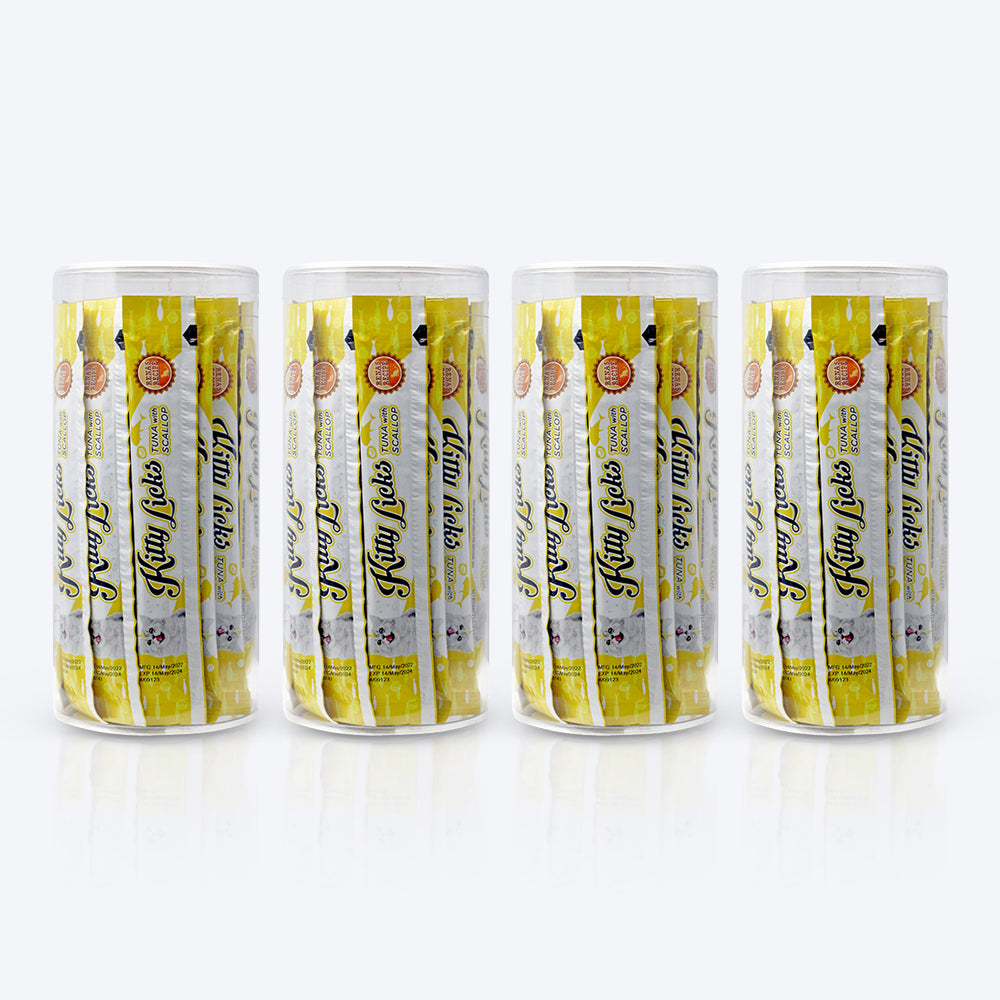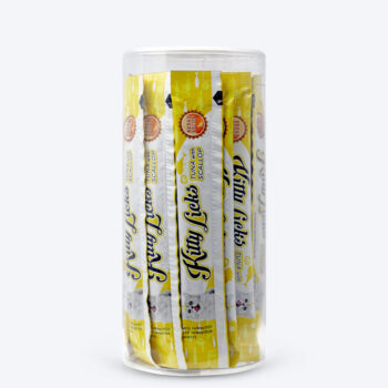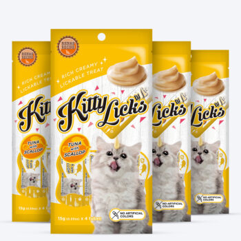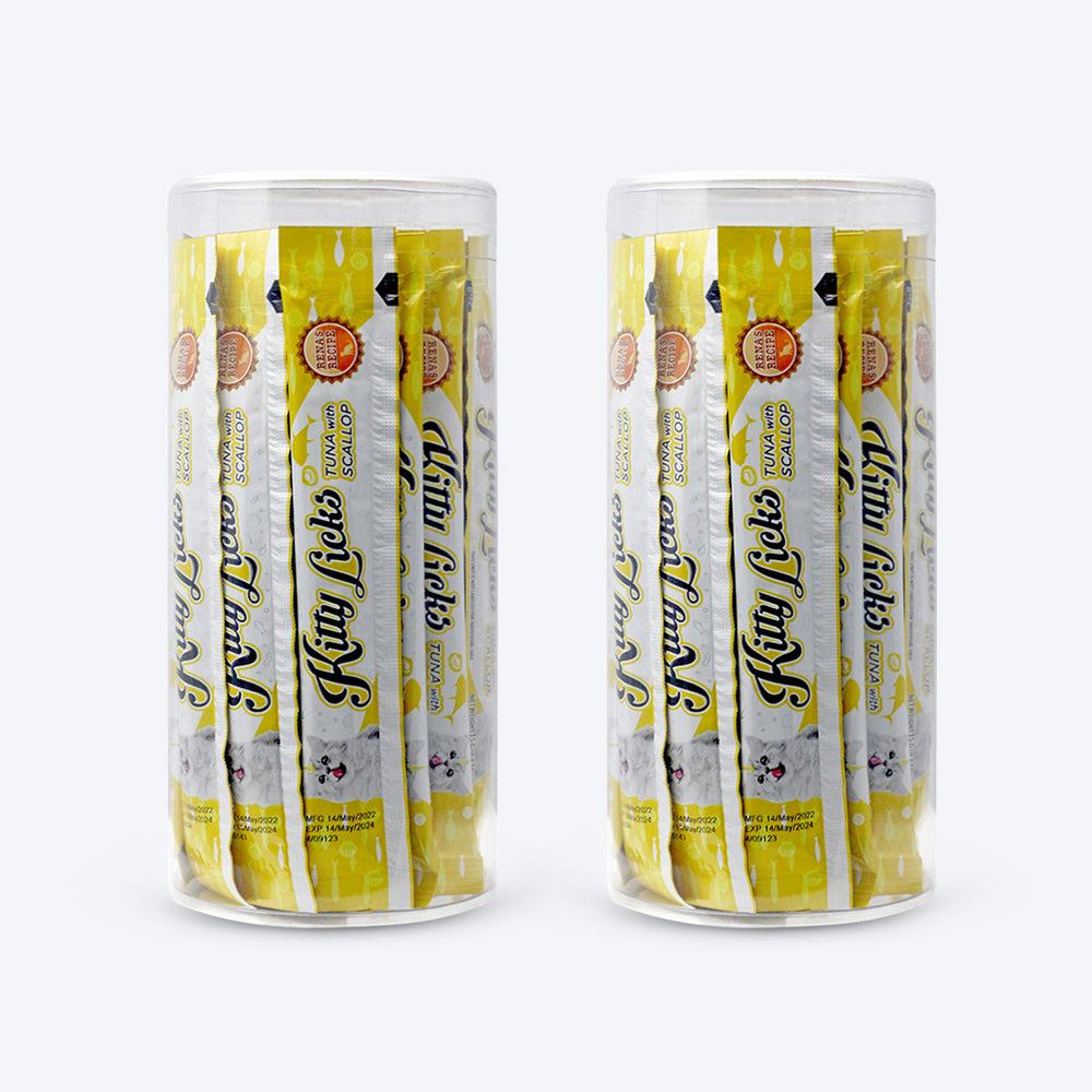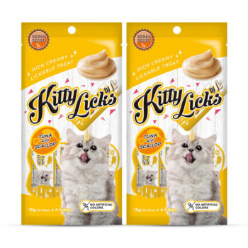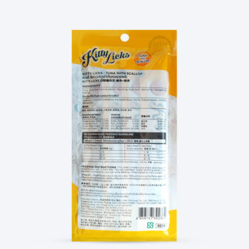 Rena's Kitty Licks Tuna with Scallop is a delectable treat for every adult cat. It contains tuna and is high in fiber, which helps the digestive system. Taurines, which are found in Rena's Kitty Licks Tuna with Scallop, help with vision. It contains Omega 6, Zinc, and DL-Methionine, which help to improve the skin and coat.' Made in Thailand. Rich Creamy, Lickable Treat. Tuna with Scallop Flavor. No artificial colors used.