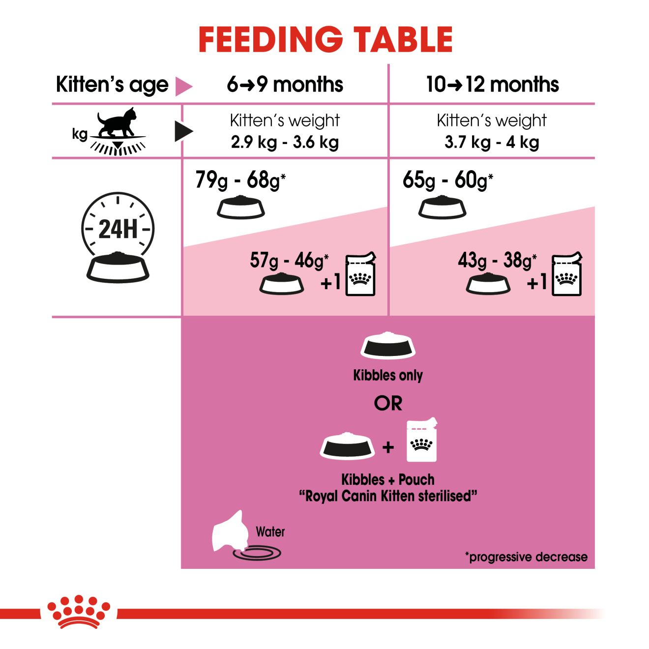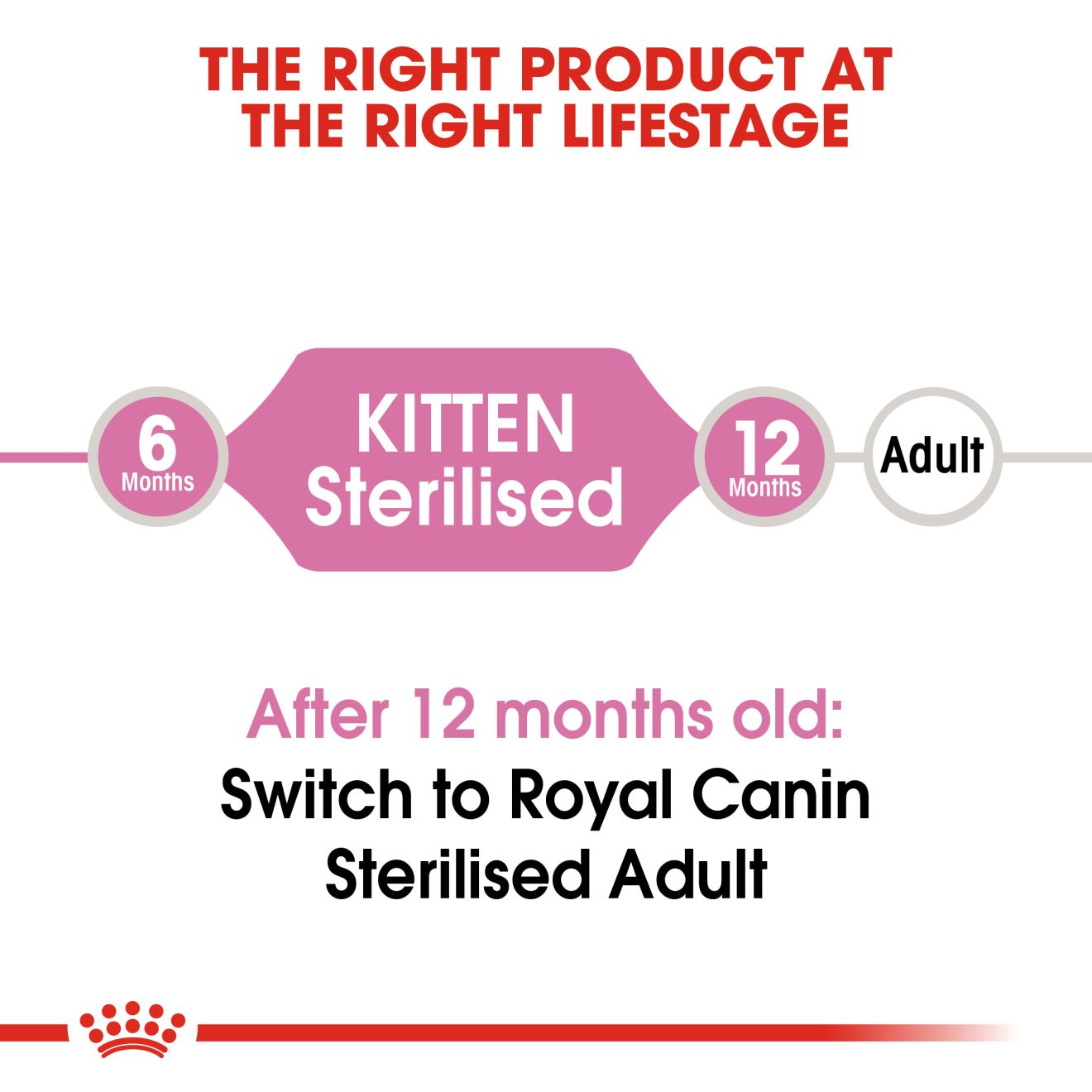 As your kitten begins to grow and explore its surroundings with a new-found sense of curiosity, this period of new discoveries at 6 to 12 months old means that your kitten's immune system will need extra support - particularly if it has been sterilised.ROYAL CANIN® Kitten Sterilised is designed with your kitten's needs in mind at this crucial time in its development. With nutrients included to help support your kitten's natural defences after being spayed or neutered, you can help maintain its health throughout its second age life stage.ROYAL CANIN® Kitten Sterilised food contains a special combination of proteins, vitamins, minerals, and a patented complex of antioxidants - all designed to keep your kitten healthy as it grows into a strong adult cat.To cater to each cat's individual preferences, ROYAL CANIN® Kitten Sterilised is also available as wet food in either a delicious gravy or succulent jelly. If you're considering mixed feeding, simply follow our feeding guidelines to ensure your cat gets an accurate amount of both wet and dry food for optimal benefit.